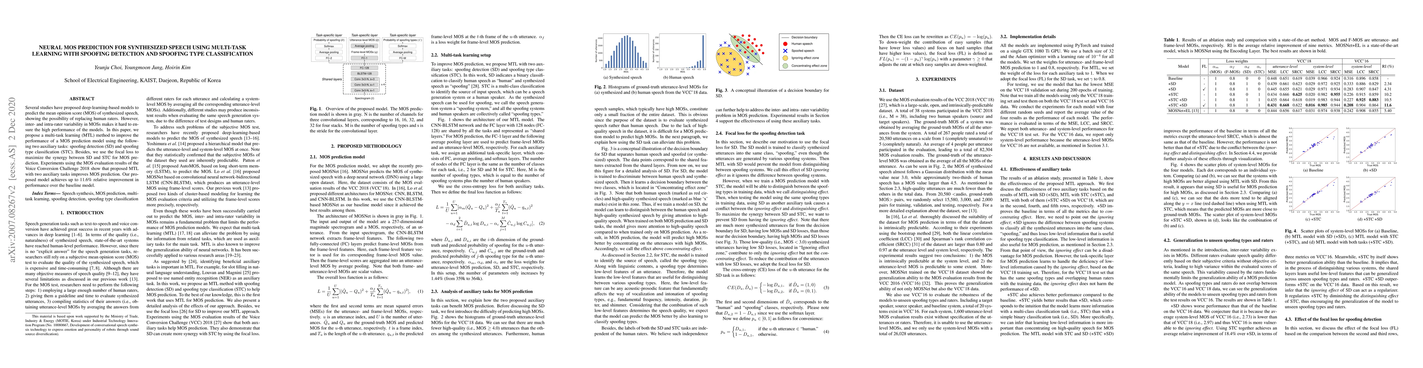 A deep-learning model improves MOS prediction of synthesized speech by combining multiple tasks: spoofing detection and classification, with a focus on increasing performance and reducing inter-rater variability.