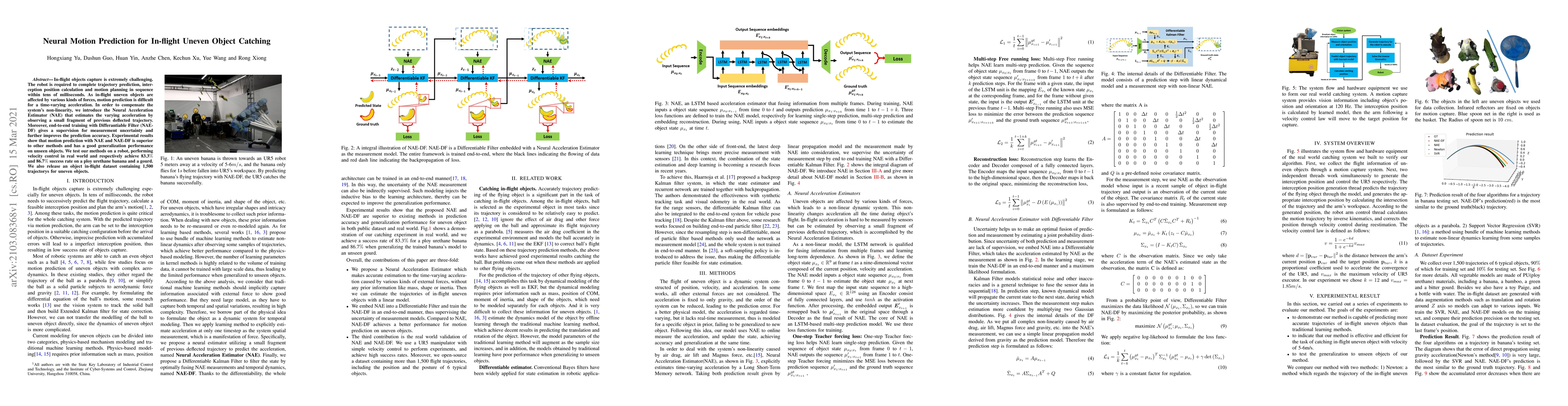This paper proposes a Neural Acceleration Estimator (NAE) to predict the motion of in-flight uneven objects, addressing the challenge of time-varying acceleration. The NAE-DF method, combining NAE with a Differentiable Filter, enhances prediction accuracy and generalizes well to unseen objects, achieving 83.3% and 86.7% success rates on polyurethane banana and gourd tests.