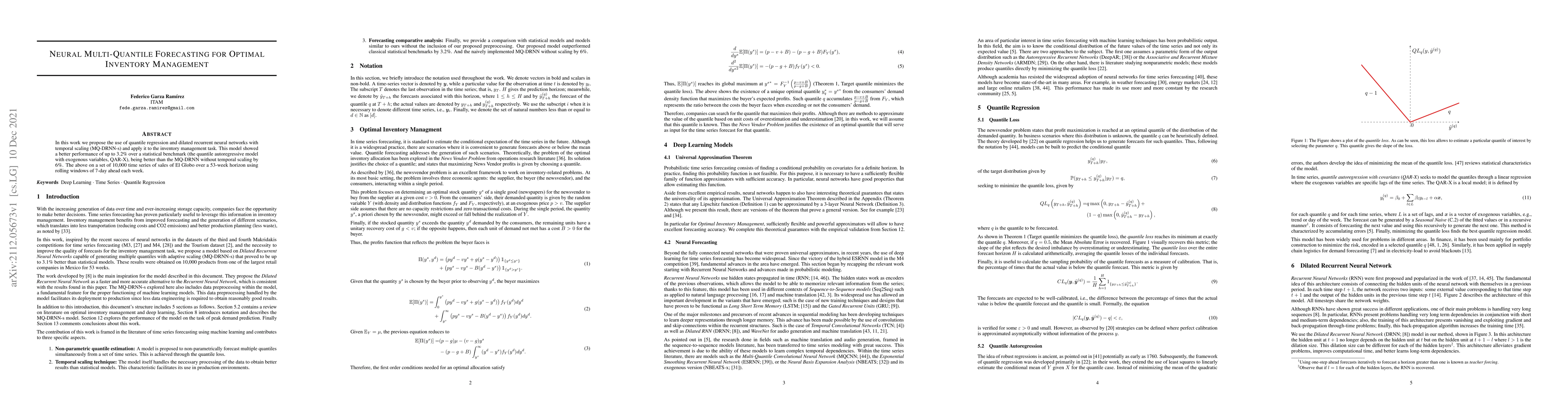 This paper proposes a neural multi-quantile forecasting model (MQ-DRNN-s) for inventory management, achieving up to 3.2% better performance than a statistical benchmark (QAR-X) on a dataset of El Globo's sales time series over a 53-week horizon.