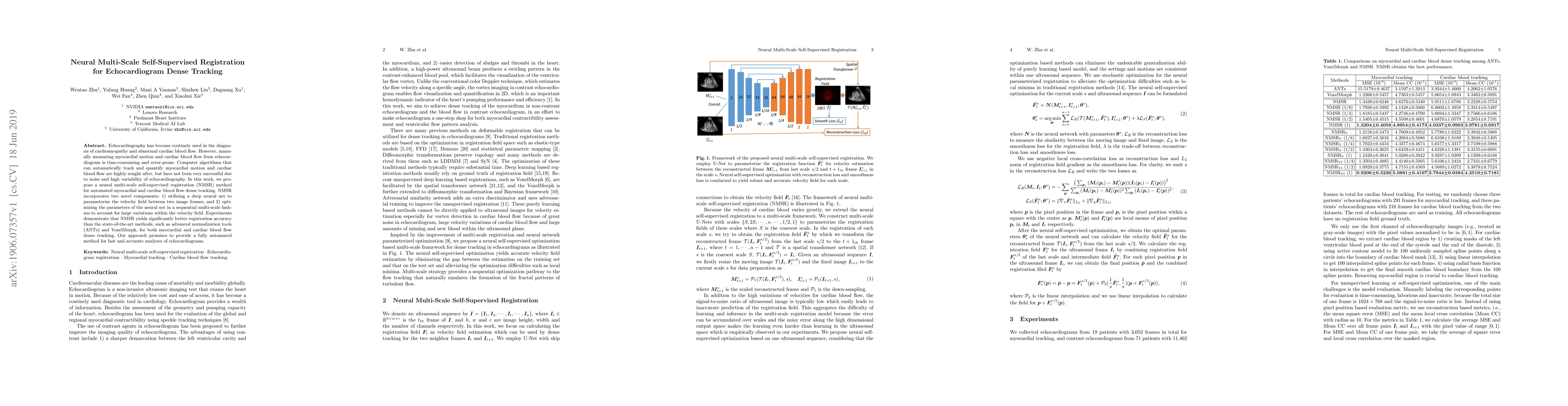 This paper proposes a neural multi-scale self-supervised registration (NMSR) method to automate the tracking and quantification of myocardial motion and cardiac blood flow in echocardiograms. NMSR uses a deep neural network to parameterize the velocity field and optimizes it in a multi-scale fashion for improved accuracy, outperforming existing methods like ANTs and VoxelMorph.