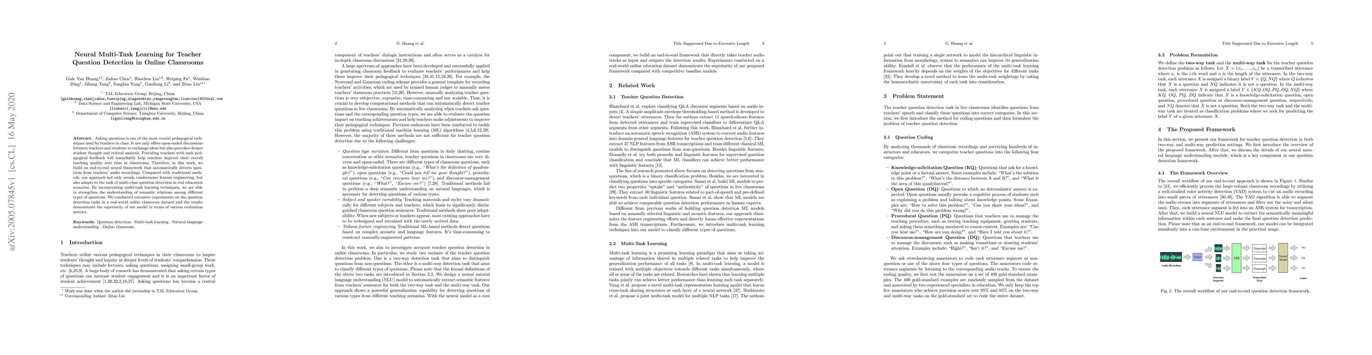 Asking questions is one of the most crucial pedagogical techniques used by teachers in class. It not only offers open-ended discussions between teachers and students to exchange ideas but also provokes deeper student thought and critical analysis. Providing teachers with such pedagogical feedback will remarkably help teachers improve their overall teaching quality over time in classrooms. Therefore, in this work, we build an end-to-end neural framework that automatically detects questions from teachers' audio recordings. Compared with traditional methods, our approach not only avoids cumbersome feature engineering, but also adapts to the task of multi-class question detection in real education scenarios. By incorporating multi-task learning techniques, we are able to strengthen the understanding of semantic relations among different types of questions. We conducted extensive experiments on the question detection tasks in a real-world online classroom dataset and the results demonstrate the superiority of our model in terms of various evaluation metrics.