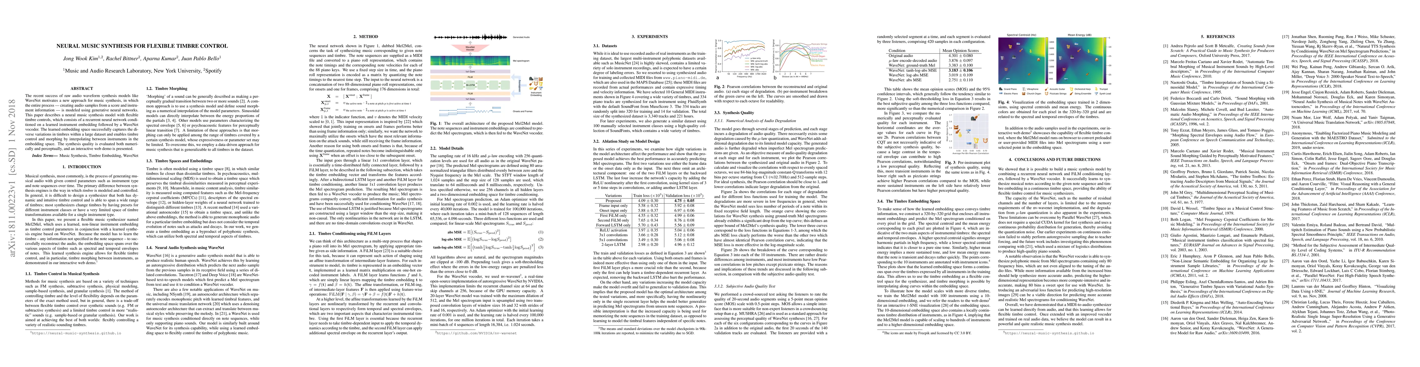 This paper introduces a neural music synthesis model that uses a recurrent neural network conditioned on an instrument embedding and a WaveNet vocoder for flexible timbre control, enabling timbre morphing through interpolation in the embedding space. The model's synthesis quality is evaluated both numerically and perceptually, with an interactive web demo provided for demonstration.