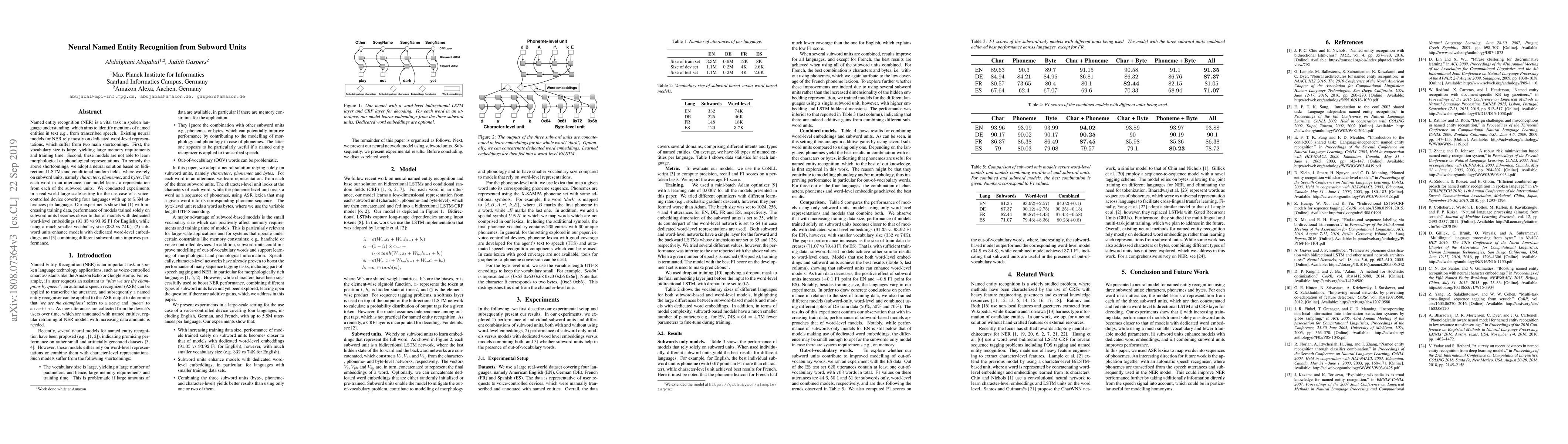 This paper proposes a neural named entity recognition (NER) model using subword units to address the limitations of word-level representations, achieving competitive performance with a significantly smaller vocabulary size. Experiments show that subword units improve model performance, especially with larger datasets, and combining different subword units further enhances results.