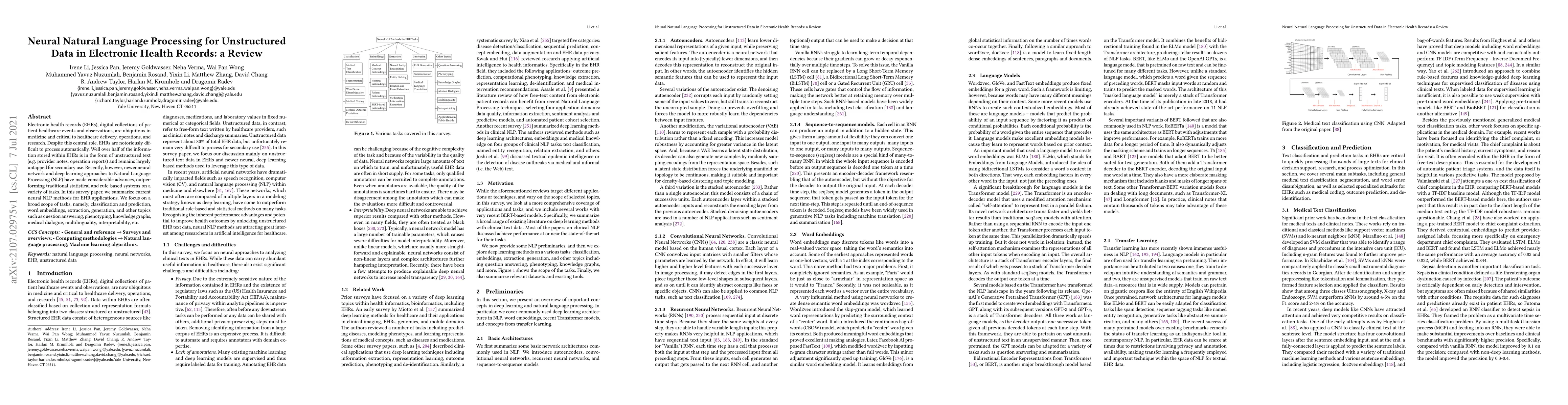This paper reviews recent neural Natural Language Processing (NLP) methods for processing unstructured data in Electronic Health Records (EHRs), highlighting advancements in tasks like classification, prediction, and extraction, and discussing emerging topics like question answering and interpretability.