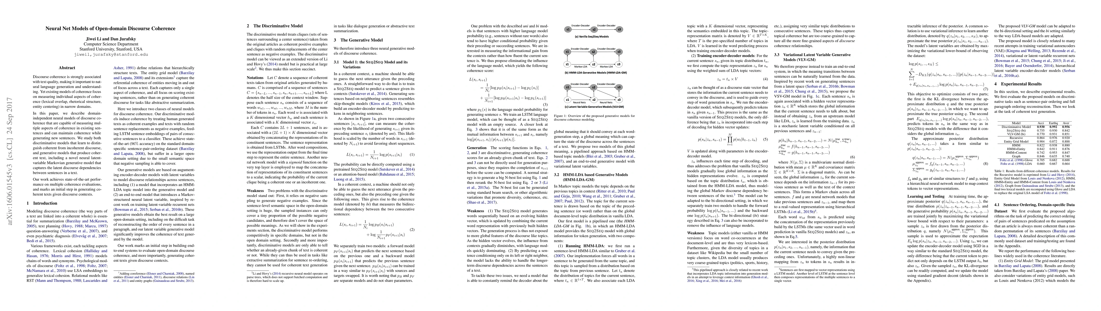 This paper introduces domain-independent neural models for measuring and generating coherent discourse, achieving state-of-the-art performance in multiple coherence evaluations. It explores both discriminative and generative models, including a novel neural latent-variable Markovian model for capturing latent discourse dependencies.