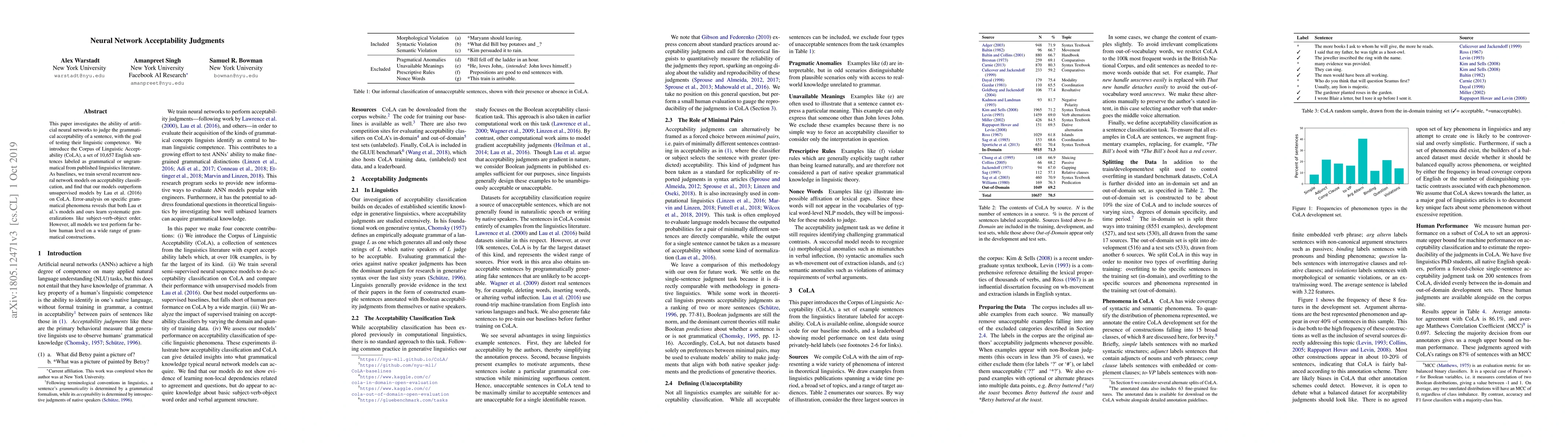 This paper evaluates neural networks' ability to judge English sentence grammaticality using a new dataset, CoLA, and finds that trained models outperform previous unsupervised approaches, though they still lag significantly behind human performance in complex grammatical judgments.