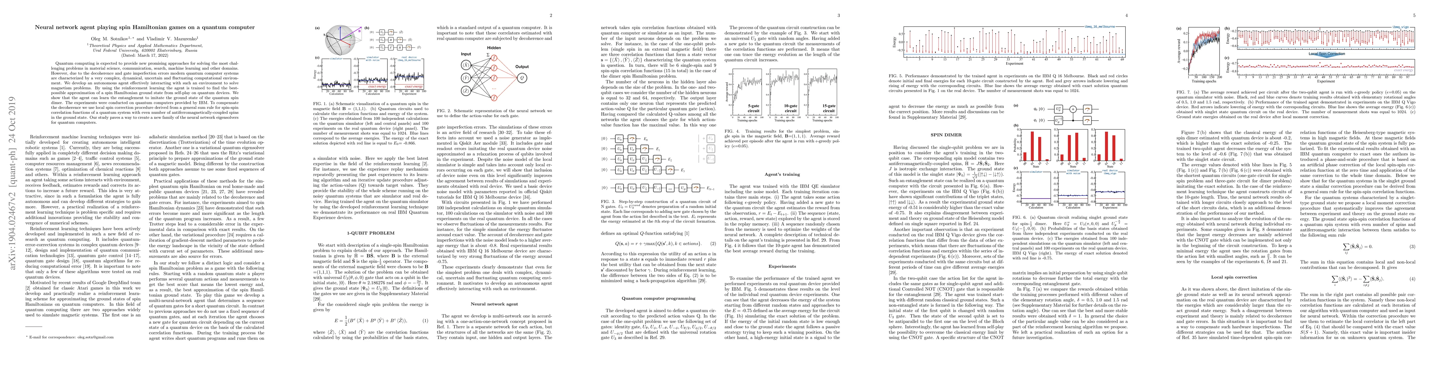 Quantum computing is expected to provide new promising approaches for solving the most challenging problems in material science, communication, search, machine learning and other domains. However, due to the decoherence and gate imperfection errors modern quantum computer systems are characterized by a very complex, dynamical, uncertain and fluctuating computational environment. We develop an autonomous agent effectively interacting with such an environment to solve magnetism problems. By using the reinforcement learning the agent is trained to find the best-possible approximation of a spin Hamiltonian ground state from self-play on quantum devices. We show that the agent can learn the entanglement to imitate the ground state of the quantum spin dimer. The experiments were conducted on quantum computers provided by IBM. To compensate the decoherence we use local spin correction procedure derived from a general sum rule for spin-spin correlation functions of a quantum system with even number of antiferromagnetically-coupled spins in the ground state. Our study paves a way to create a new family of the neural network eigensolvers for quantum computers.