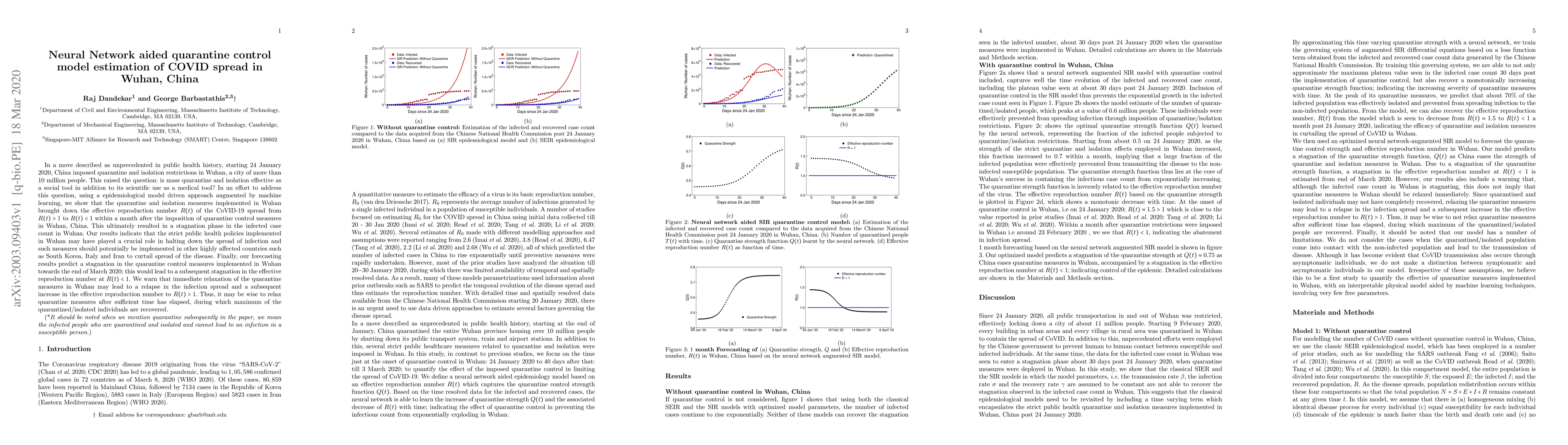 In a move described as unprecedented in public health history, starting 24 January 2020, China imposed quarantine and isolation restrictions in Wuhan, a city of more than 10 million people. This raised the question: is mass quarantine and isolation effective as a social tool in addition to its scientific use as a medical tool? In an effort to address this question, using a epidemiological model driven approach augmented by machine learning, we show that the quarantine and isolation measures implemented in Wuhan brought down the effective reproduction number R(t) of the CoVID-19 spread from R(t) > 1 to R(t) <1 within a month after the imposition of quarantine control measures in Wuhan, China. This ultimately resulted in a stagnation phase in the infected case count in Wuhan. Our results indicate that the strict public health policies implemented in Wuhan may have played a crucial role in halting down the spread of infection and such measures should potentially be implemented in other highly affected countries such as South Korea, Italy and Iran to curtail spread of the disease. Finally, our forecasting results predict a stagnation in the quarantine control measures implemented in Wuhan towards the end of March 2020; this would lead to a subsequent stagnation in the effective reproduction number at R(t) <1. We warn that immediate relaxation of the quarantine measures in Wuhan may lead to a relapse in the infection spread and a subsequent increase in the effective reproduction number to R(t) >1. Thus, it may be wise to relax quarantine measures after sufficient time has elapsed, during which maximum of the quarantined/isolated individuals are recovered.