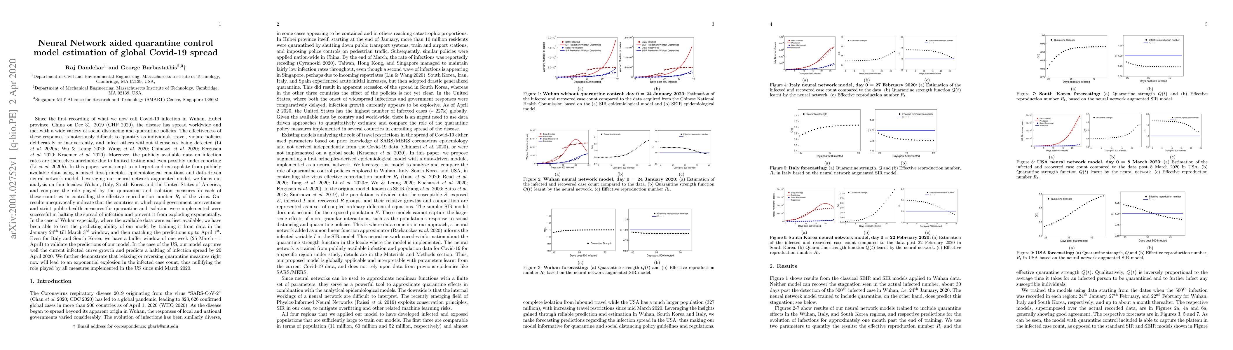 This paper combines epidemiological models and neural networks to estimate the impact of quarantine measures on Covid-19 spread in Wuhan, Italy, South Korea, and the USA. The model shows that rapid government interventions and strict quarantine were effective in controlling the virus spread, predicting a halt in infection growth if measures are maintained.