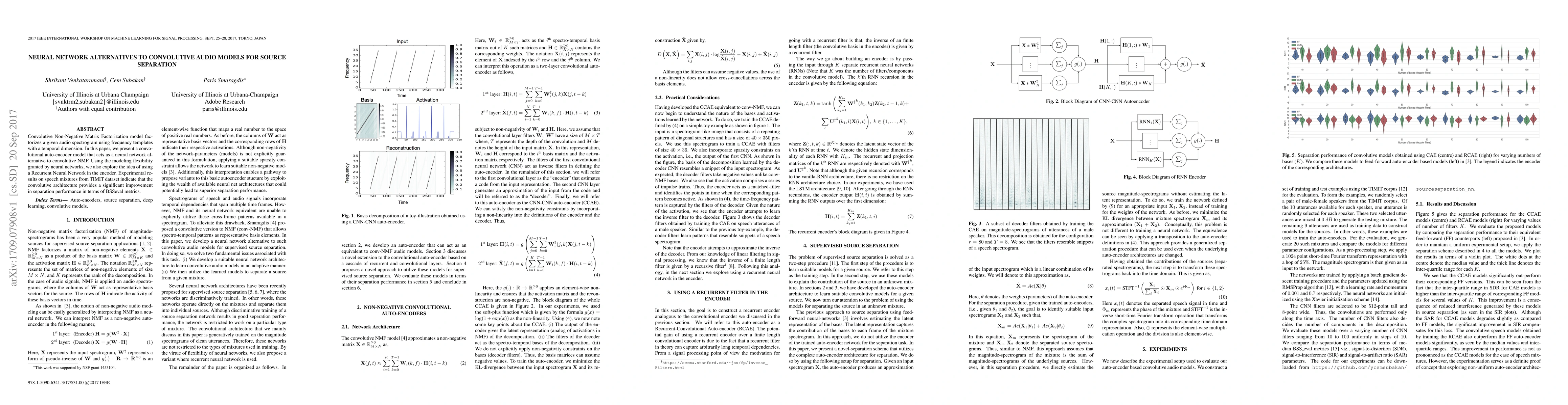 This paper proposes a convolutional auto-encoder and a Recurrent Neural Network (RNN) encoder as alternatives to Convolutive Non-Negative Matrix Factorization for audio source separation. Experimental results show significant improvements in separation performance over traditional methods on the TIMIT dataset.