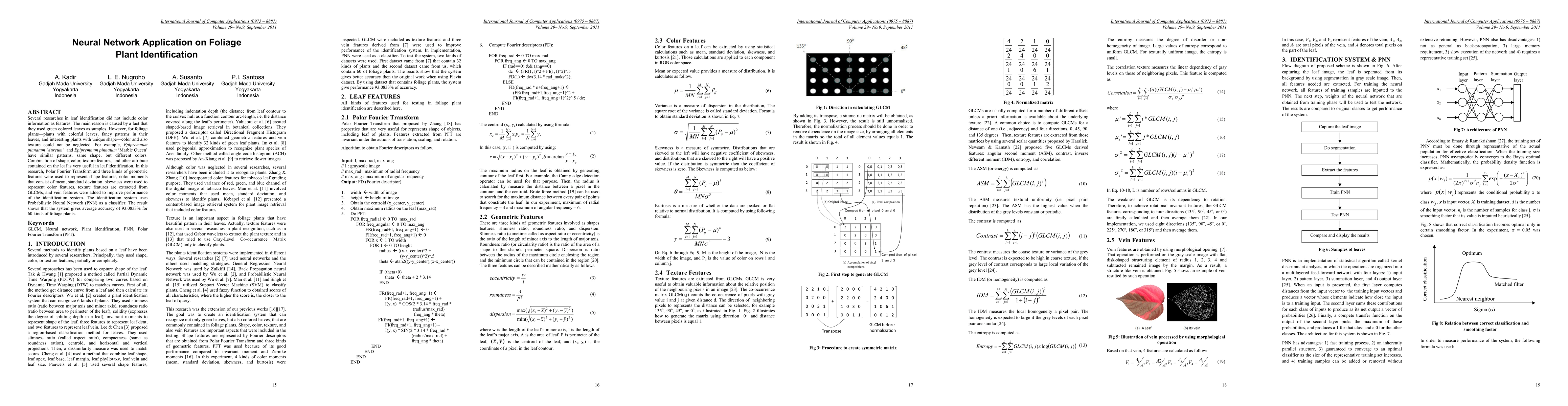 This research utilizes shape, color, texture, and vein features from foliage plants' leaves, combining Polar Fourier Transform, color moments, GLCMs, and a Probabilistic Neural Network (PNN) classifier. The method achieved an average accuracy of 93.0833% in identifying 60 types of colorful, patterned foliage plants.