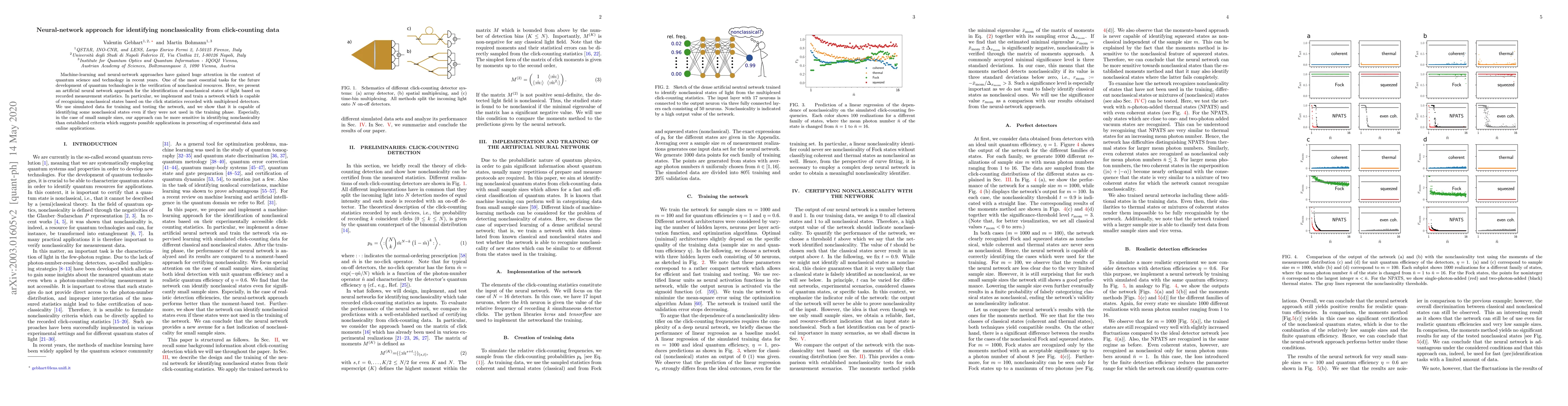 This paper proposes an artificial neural network to identify nonclassical states of light from click-counting data, trained on simulated data. It demonstrates the network's ability to recognize nonclassical states not seen during training, showing potential for improved sensitivity over traditional methods, especially with small sample sizes.