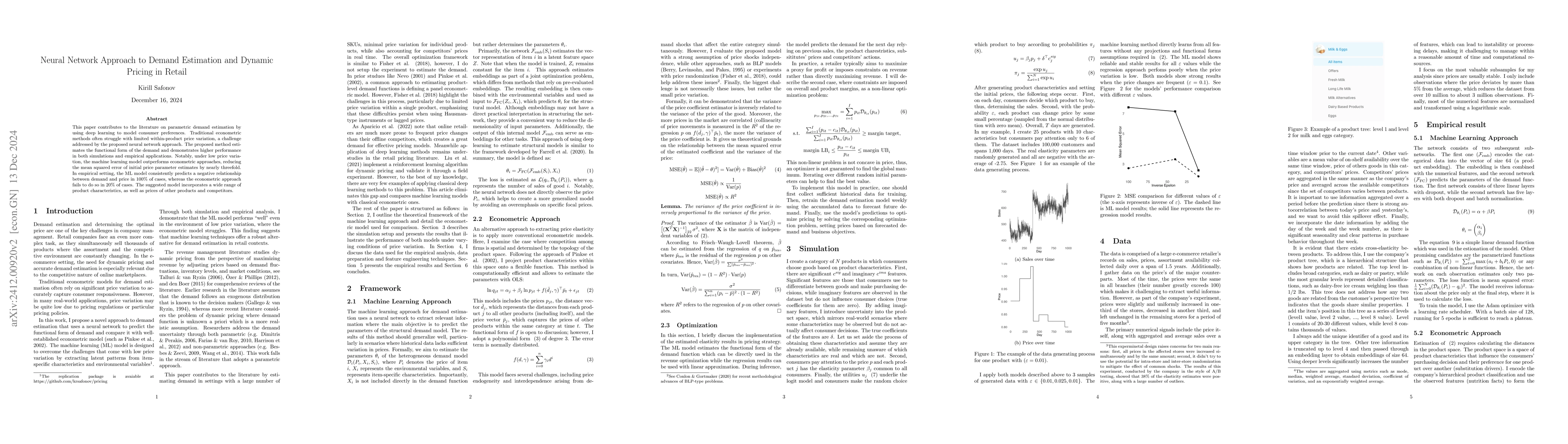 This paper introduces a neural network method for demand estimation and dynamic pricing in retail, demonstrating superior performance over traditional econometric models, especially under low price variation, by reducing the mean squared error of initial price parameter estimates by nearly threefold. The machine learning model accurately predicts the negative relationship between demand and price in all empirical cases.
