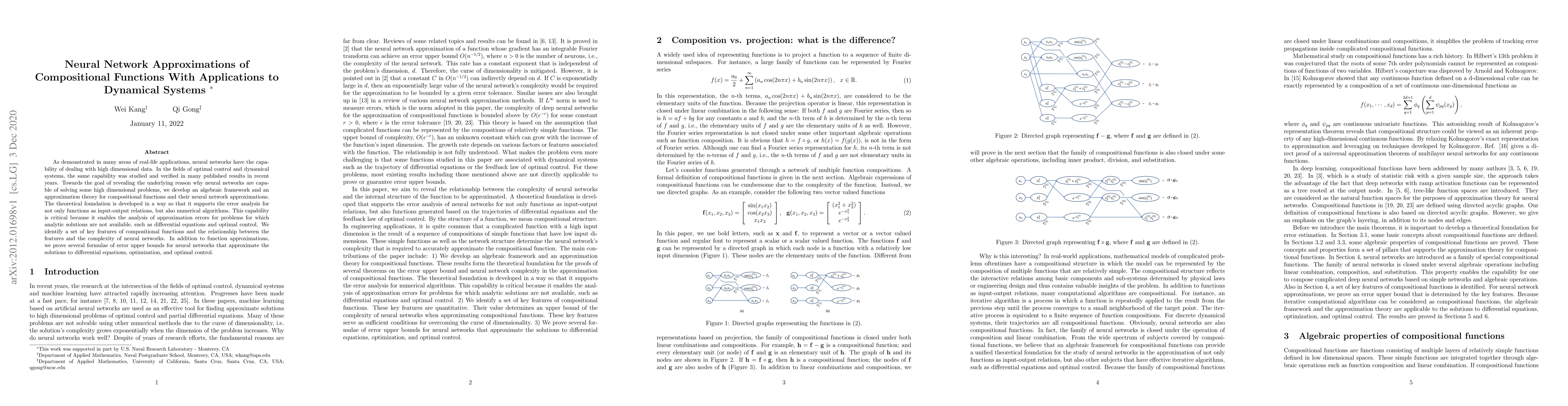 As demonstrated in many areas of real-life applications, neural networks have the capability of dealing with high dimensional data. In the fields of optimal control and dynamical systems, the same capability was studied and verified in many published results in recent years. Towards the goal of revealing the underlying reason why neural networks are capable of solving some high dimensional problems, we develop an algebraic framework and an approximation theory for compositional functions and their neural network approximations. The theoretical foundation is developed in a way so that it supports the error analysis for not only functions as input-output relations, but also numerical algorithms. This capability is critical because it enables the analysis of approximation errors for problems for which analytic solutions are not available, such as differential equations and optimal control. We identify a set of key features of compositional functions and the relationship between the features and the complexity of neural networks. In addition to function approximations, we prove several formulae of error upper bounds for neural networks that approximate the solutions to differential equations, optimization, and optimal control.