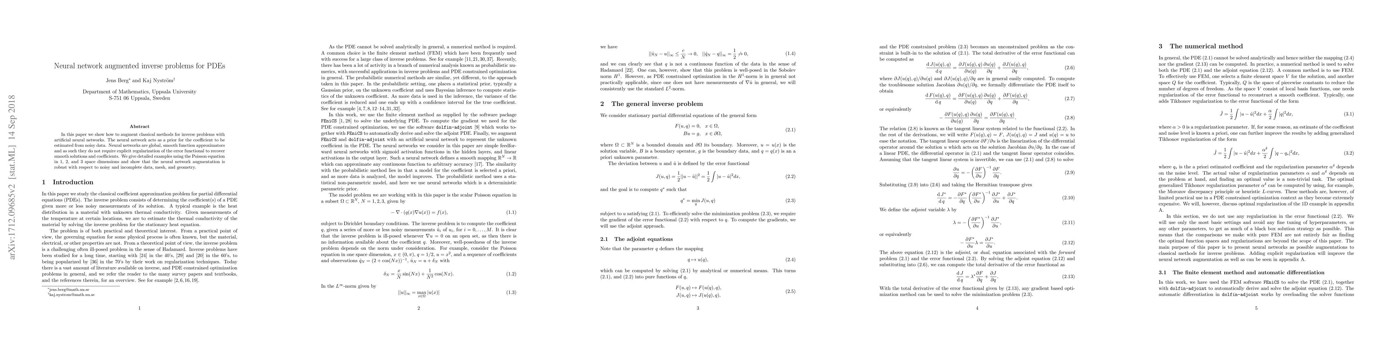 In this paper we show how to augment classical methods for inverse problems with artificial neural networks. The neural network acts as a prior for the coefficient to be estimated from noisy data. Neural networks are global, smooth function approximators and as such they do not require explicit regularization of the error functional to recover smooth solutions and coefficients. We give detailed examples using the Poisson equation in 1, 2, and 3 space dimensions and show that the neural network augmentation is robust with respect to noisy and incomplete data, mesh, and geometry.