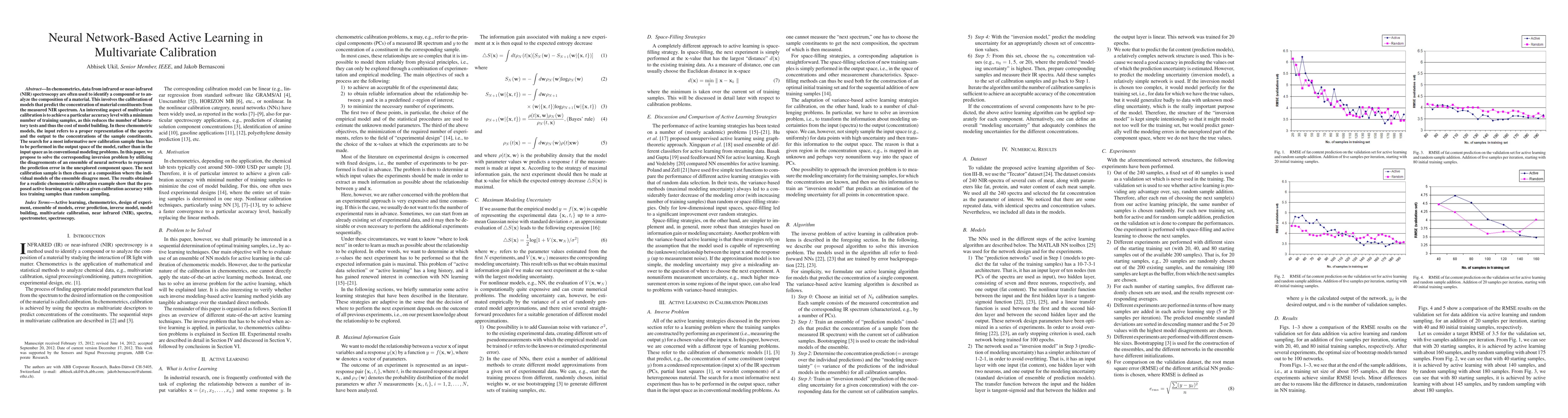 In chemometrics, data from infrared or near-infrared (NIR) spectroscopy are often used to identify a compound or to analyze the composition of amaterial. This involves the calibration of models that predict the concentration ofmaterial constituents from the measured NIR spectrum. An interesting aspect of multivariate calibration is to achieve a particular accuracy level with a minimum number of training samples, as this reduces the number of laboratory tests and thus the cost of model building. In these chemometric models, the input refers to a proper representation of the spectra and the output to the concentrations of the sample constituents. The search for a most informative new calibration sample thus has to be performed in the output space of the model, rather than in the input space as in conventionalmodeling problems. In this paper, we propose to solve the corresponding inversion problem by utilizing the disagreements of an ensemble of neural networks to represent the prediction error in the unexplored component space. The next calibration sample is then chosen at a composition where the individual models of the ensemble disagree most. The results obtained for a realistic chemometric calibration example show that the proposed active learning can achieve a given calibration accuracy with less training samples than random sampling.