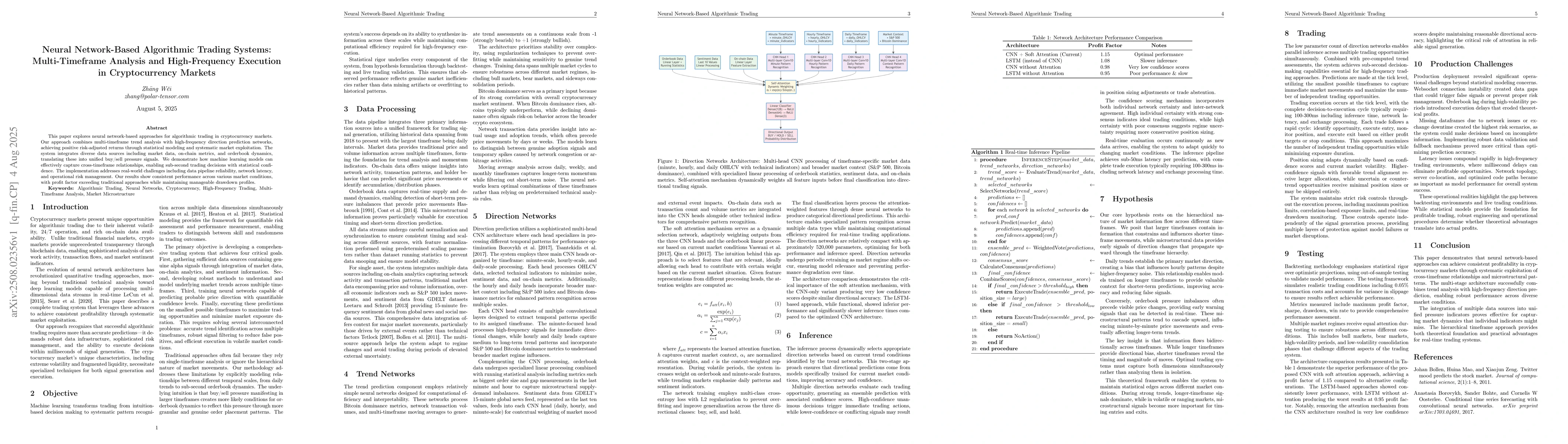 This paper explores neural network-based approaches for algorithmic trading in cryptocurrency markets. Our approach combines multi-timeframe trend analysis with high-frequency direction prediction networks, achieving positive risk-adjusted returns through statistical modeling and systematic market exploitation. The system integrates diverse data sources including market data, on-chain metrics, and orderbook dynamics, translating these into unified buy/sell pressure signals. We demonstrate how machine learning models can effectively capture cross-timeframe relationships, enabling sub-second trading decisions with statistical confidence.