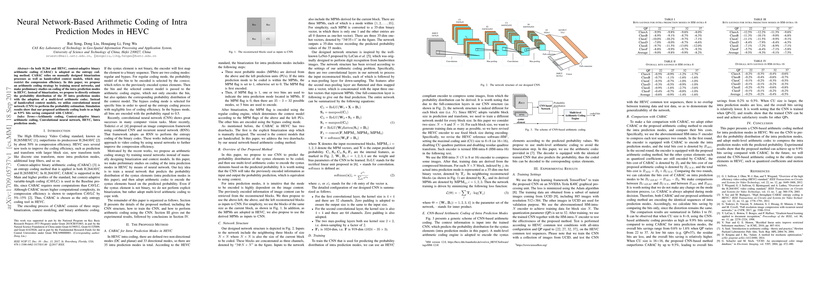 This paper proposes a neural network-based arithmetic coding method for intra prediction modes in HEVC, replacing traditional CABAC with a CNN-driven approach to directly estimate probability distributions, achieving up to 9.9% bit savings.