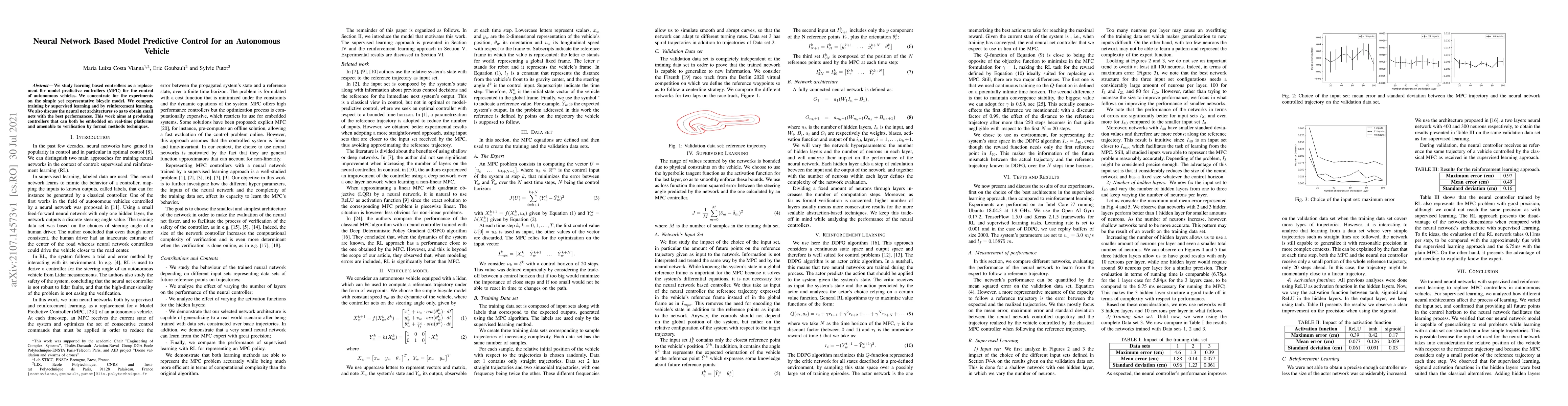 We study learning based controllers as a replacement for model predictive controllers (MPC) for the control of autonomous vehicles. We concentrate for the experiments on the simple yet representative bicycle model. We compare training by supervised learning and by reinforcement learning. We also discuss the neural net architectures so as to obtain small nets with the best performances. This work aims at producing controllers that can both be embedded on real-time platforms and amenable to verification by formal methods techniques.