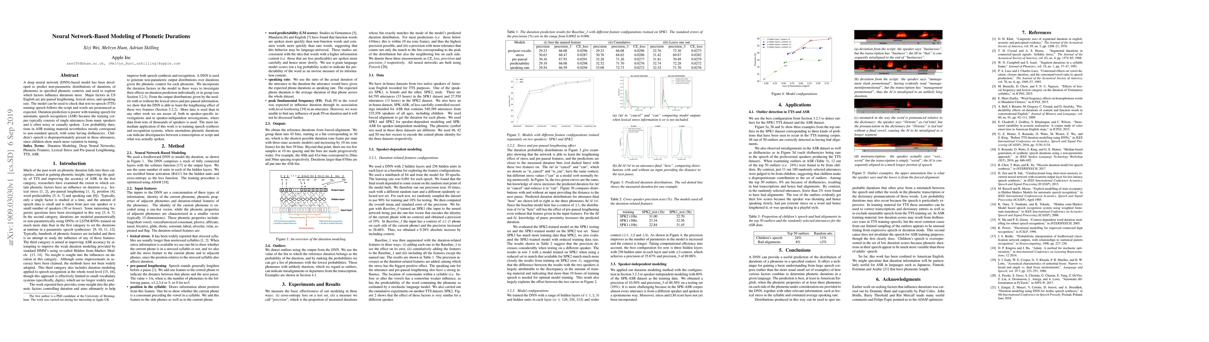 A deep neural network (DNN)-based model has been developed to predict non-parametric distributions of durations of phonemes in specified phonetic contexts and used to explore which factors influence durations most. Major factors in US English are pre-pausal lengthening, lexical stress, and speaking rate. The model can be used to check that text-to-speech (TTS) training speech follows the script and words are pronounced as expected. Duration prediction is poorer with training speech for automatic speech recognition (ASR) because the training corpus typically consists of single utterances from many speakers and is often noisy or casually spoken. Low probability durations in ASR training material nevertheless mostly correspond to non-standard speech, with some having disfluencies. Children's speech is disproportionately present in these utterances, since children show much more variation in timing.