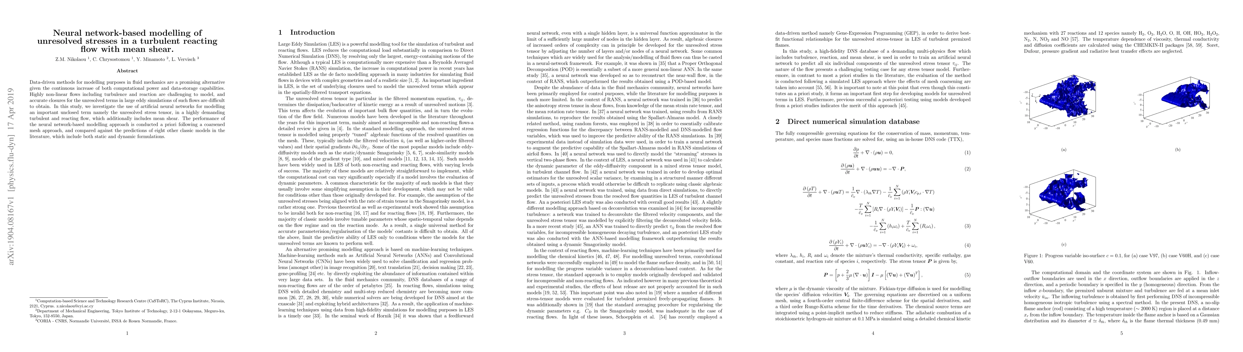 This paper explores the use of artificial neural networks to model unresolved stresses in turbulent reacting flows with mean shear, comparing its performance against eight traditional models. The neural network approach shows promise as a data-driven alternative for complex fluid dynamics simulations.