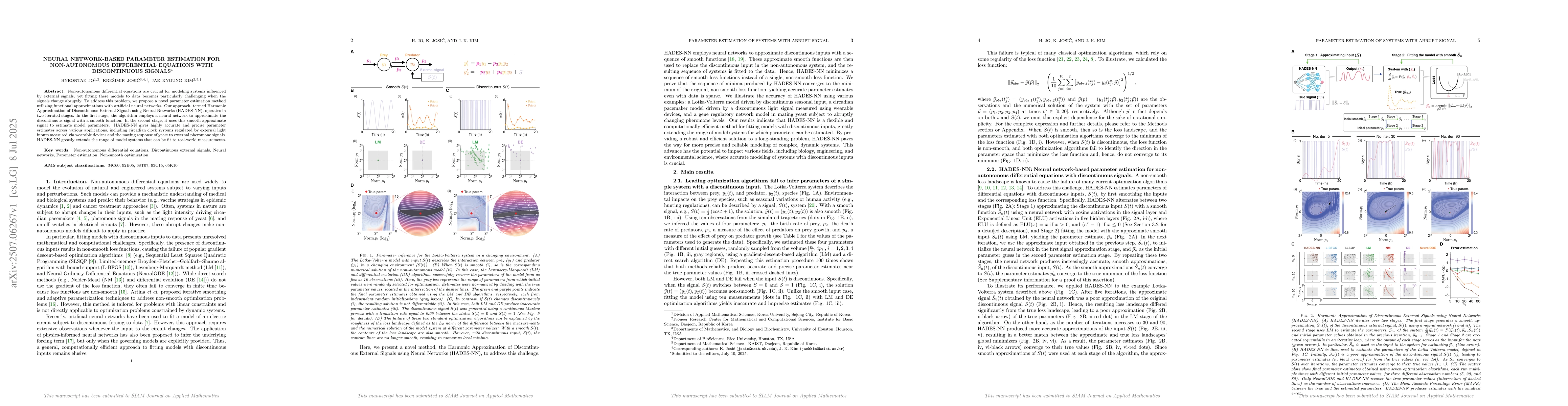 Non-autonomous differential equations are crucial for modeling systems influenced by external signals, yet fitting these models to data becomes particularly challenging when the signals change abruptly. To address this problem, we propose a novel parameter estimation method utilizing functional approximations with artificial neural networks. Our approach, termed Harmonic Approximation of Discontinuous External Signals using Neural Networks (HADES-NN), operates in two iterated stages. In the first stage, the algorithm employs a neural network to approximate the discontinuous signal with a smooth function. In the second stage, it uses this smooth approximate signal to estimate model parameters. HADES-NN gives highly accurate and precise parameter estimates across various applications, including circadian clock systems regulated by external light inputs measured via wearable devices and the mating response of yeast to external pheromone signals. HADES-NN greatly extends the range of model systems that can be fit to real-world measurements.