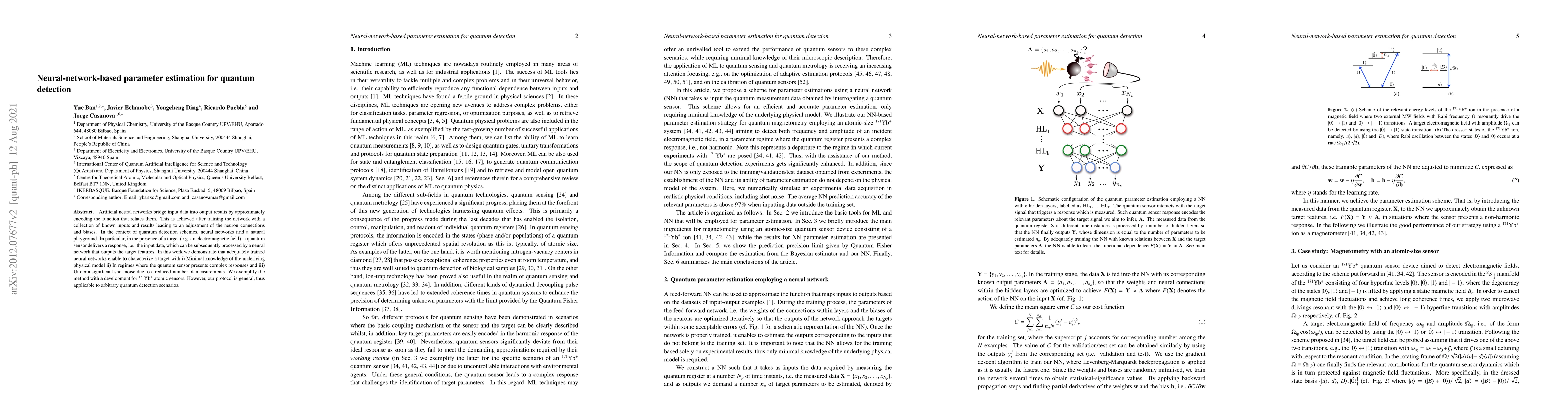 This research introduces a method using neural networks to estimate parameters in quantum detection schemes, even with limited knowledge of the physical model and under complex sensor responses and high shot noise. The approach is demonstrated with $^{171}$Yb$^{+}$ atomic sensors, but is applicable to any quantum detection scenario.