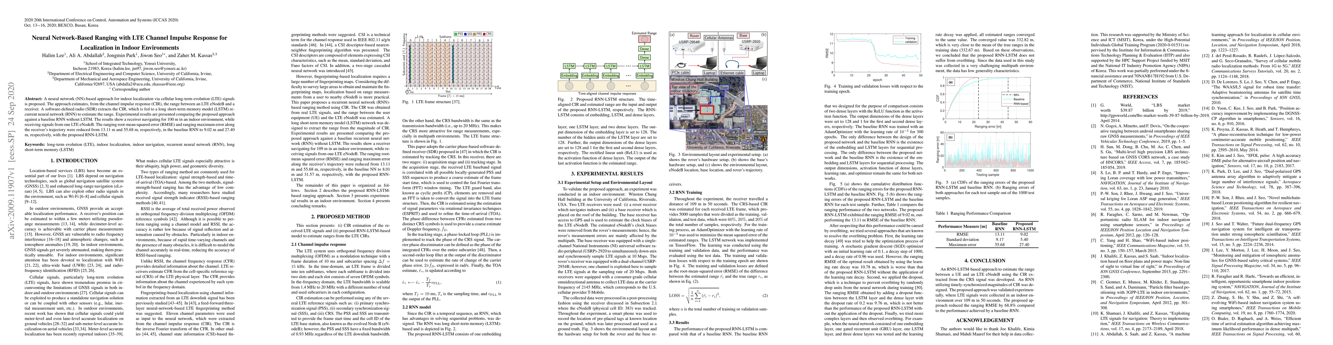 This paper proposes a neural network-based indoor localization method using LTE signals and channel impulse response (CIR) extracted via software-defined radio. The LSTM RNN model improves ranging accuracy compared to a baseline RNN, reducing RMSE and maximum error by 30% and 40%, respectively.