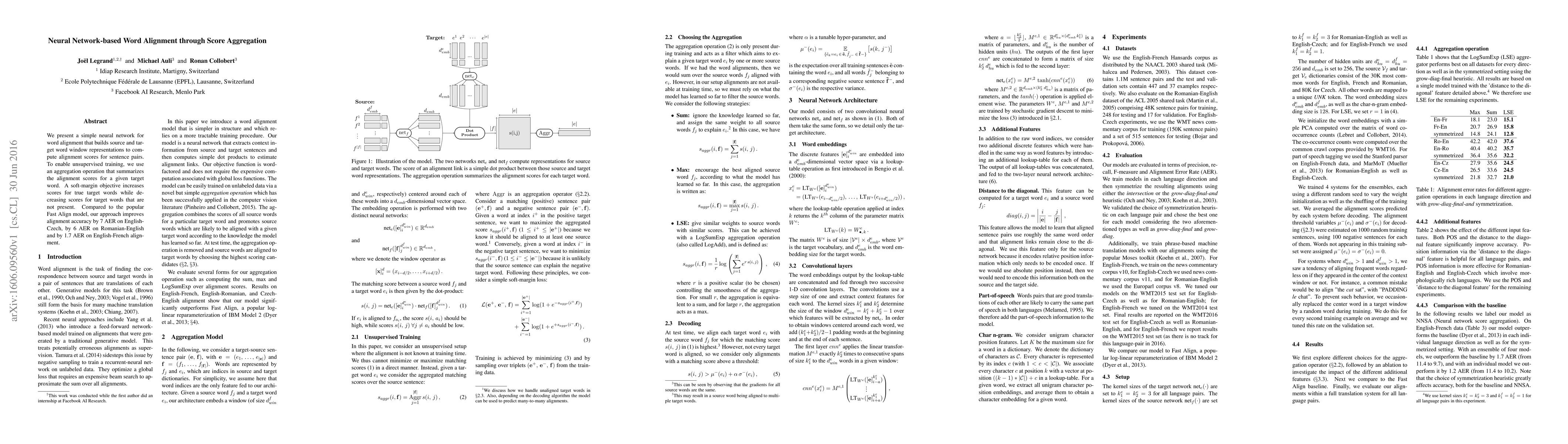 A neural network-based word alignment system outperforms Fast Align with improved accuracy on English-Czech, Romanian-English, and English-French alignments.