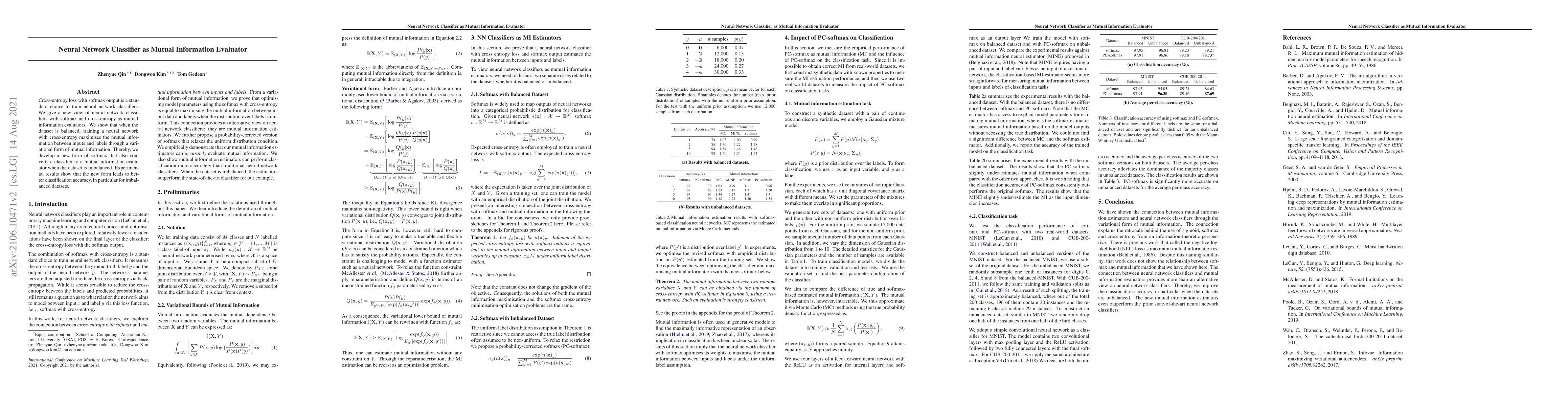 Cross-entropy loss with softmax output is a standard choice to train neural network classifiers. We give a new view of neural network classifiers with softmax and cross-entropy as mutual information evaluators. We show that when the dataset is balanced, training a neural network with cross-entropy maximises the mutual information between inputs and labels through a variational form of mutual information. Thereby, we develop a new form of softmax that also converts a classifier to a mutual information evaluator when the dataset is imbalanced. Experimental results show that the new form leads to better classification accuracy, in particular for imbalanced datasets.