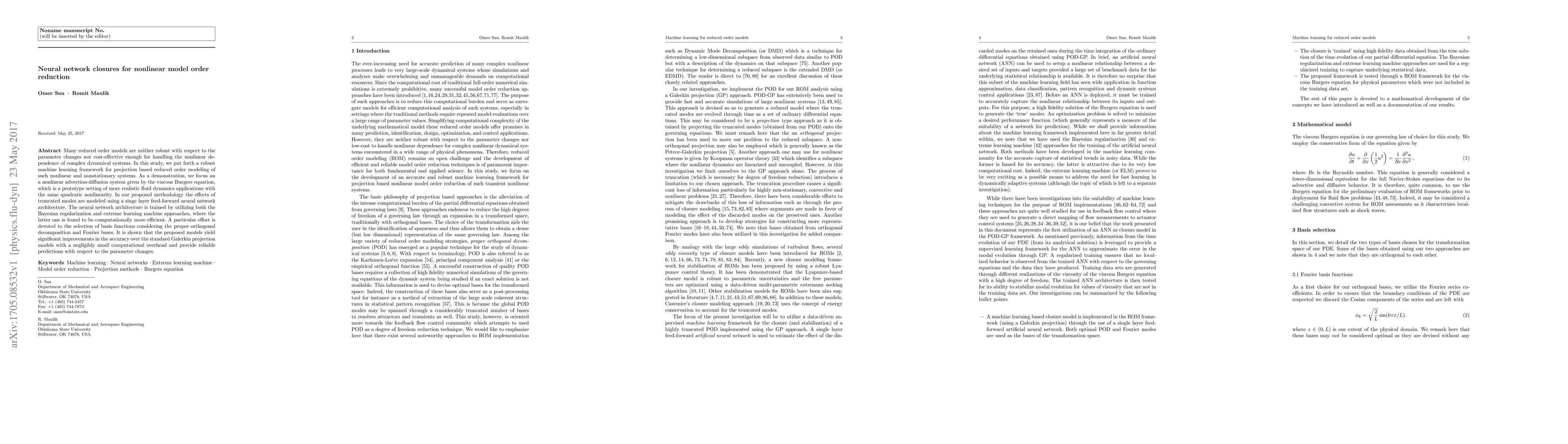 Many reduced order models are neither robust with respect to the parameter changes nor cost-effective enough for handling the nonlinear dependence of complex dynamical systems. In this study, we put forth a robust machine learning framework for projection based reduced order modeling of such nonlinear and nonstationary systems. As a demonstration, we focus on a nonlinear advection-diffusion system given by the viscous Burgers equation, which is a prototype setting of more realistic fluid dynamics applications with the same quadratic nonlinearity. In our proposed methodology the effects of truncated modes are modeled using a singe layer feed-forward neural network architecture. The neural network architecture is trained by utilizing both the Bayesian regularization and extreme learning machine approaches, where the latter one is found to be computationally more efficient. A particular effort is devoted to the selection of basis functions considering the proper orthogonal decomposition and Fourier bases. It is shown that the proposed models yield significant improvements in the accuracy over the standard Galerkin projection models with a negligibly small computational overhead and provide reliable predictions with respect to the parameter changes.