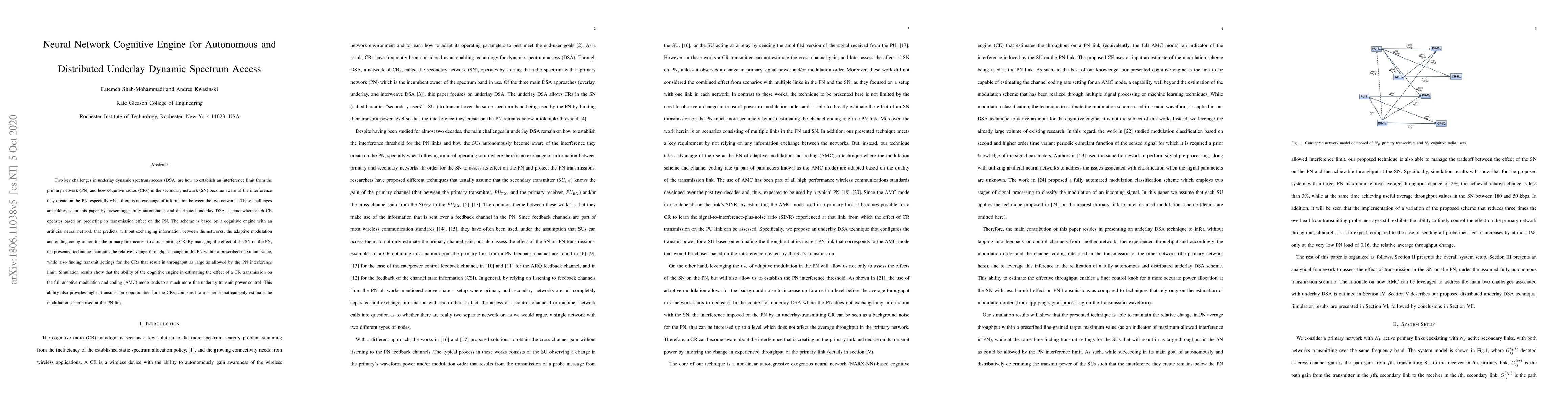 This paper proposes a neural network cognitive engine for autonomous and distributed underlay dynamic spectrum access, enabling cognitive radios to predict their interference on the primary network without direct information exchange. The engine optimizes CR transmission settings to maximize throughput while maintaining the primary network's interference limit, resulting in enhanced underlay transmit power control and increased CR opportunities.