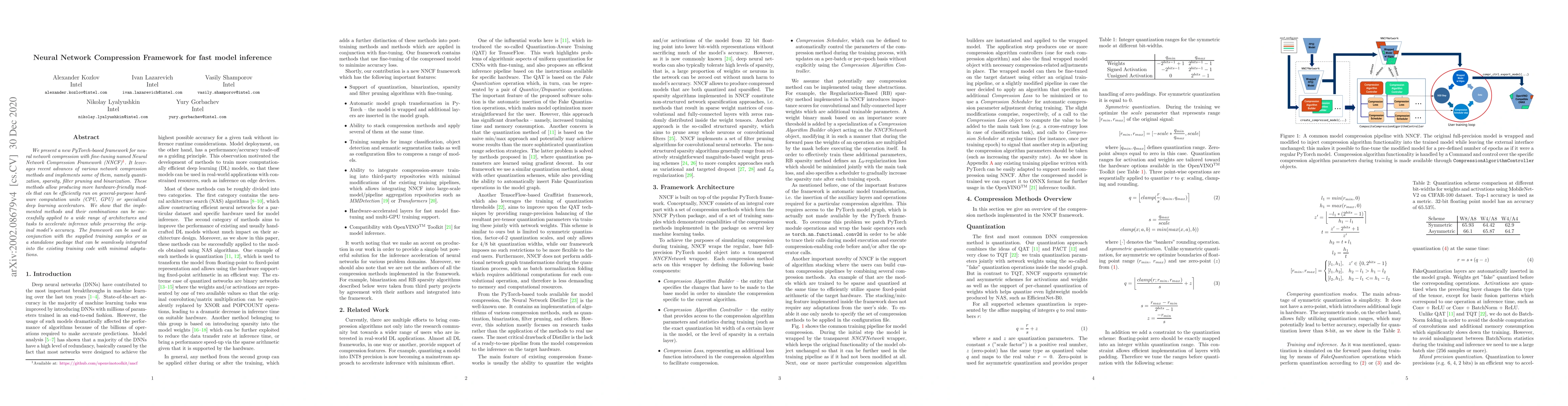 This paper introduces the Neural Network Compression Framework (NNCF), which leverages techniques like sparsity, quantization, and binarization to create hardware-friendly neural network models. The framework effectively accelerates inference time across various models while maintaining original accuracy, and can be integrated into existing training pipelines with minimal modifications.