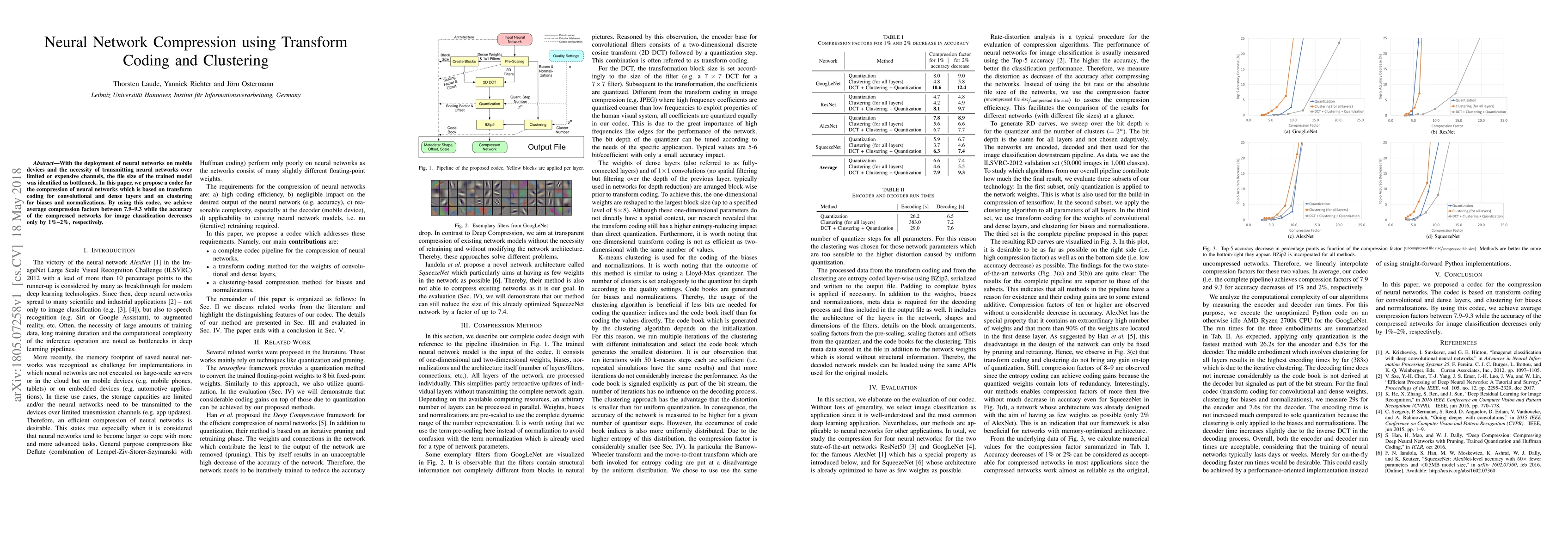 With the deployment of neural networks on mobile devices and the necessity of transmitting neural networks over limited or expensive channels, the file size of the trained model was identified as bottleneck. In this paper, we propose a codec for the compression of neural networks which is based on transform coding for convolutional and dense layers and on clustering for biases and normalizations. By using this codec, we achieve average compression factors between 7.9-9.3 while the accuracy of the compressed networks for image classification decreases only by 1%-2%, respectively.