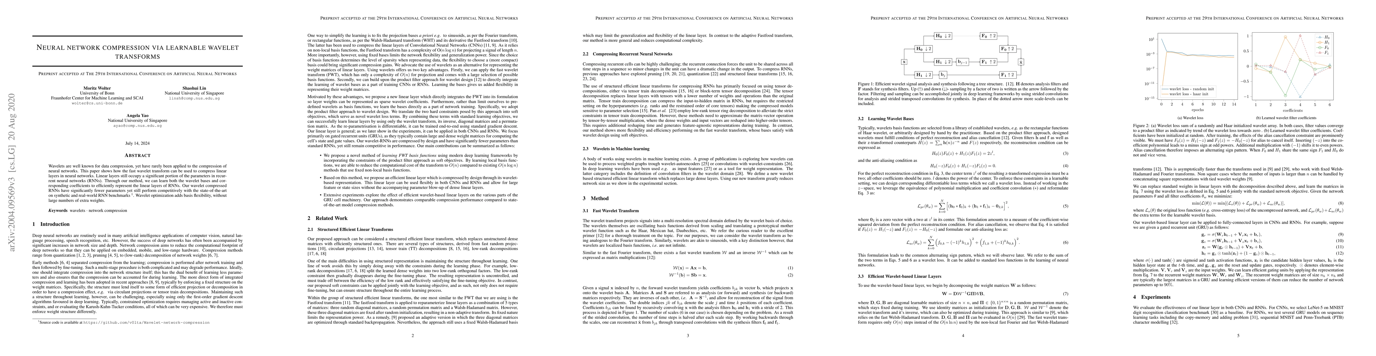 This research introduces a method to compress neural networks using learnable wavelet transforms, focusing on linear layers within recurrent neural networks (RNNs). The proposed approach learns wavelet bases and coefficients to efficiently represent RNN layers, resulting in fewer parameters and competitive performance on benchmarks without sacrificing accuracy.