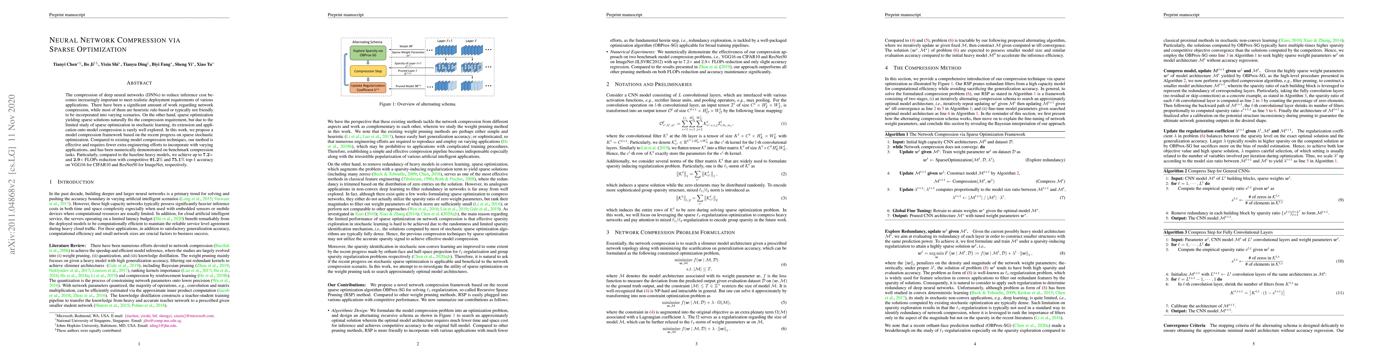 This paper proposes a neural network compression framework based on sparse optimization, which effectively reduces computational costs with fewer engineering efforts compared to existing methods. The method demonstrates significant reductions in FLOPs while maintaining accuracy on benchmark tasks, achieving up to 7.2 times reduction for VGG16 on CIFAR10 and 2.9 times for ResNet50 on ImageNet.