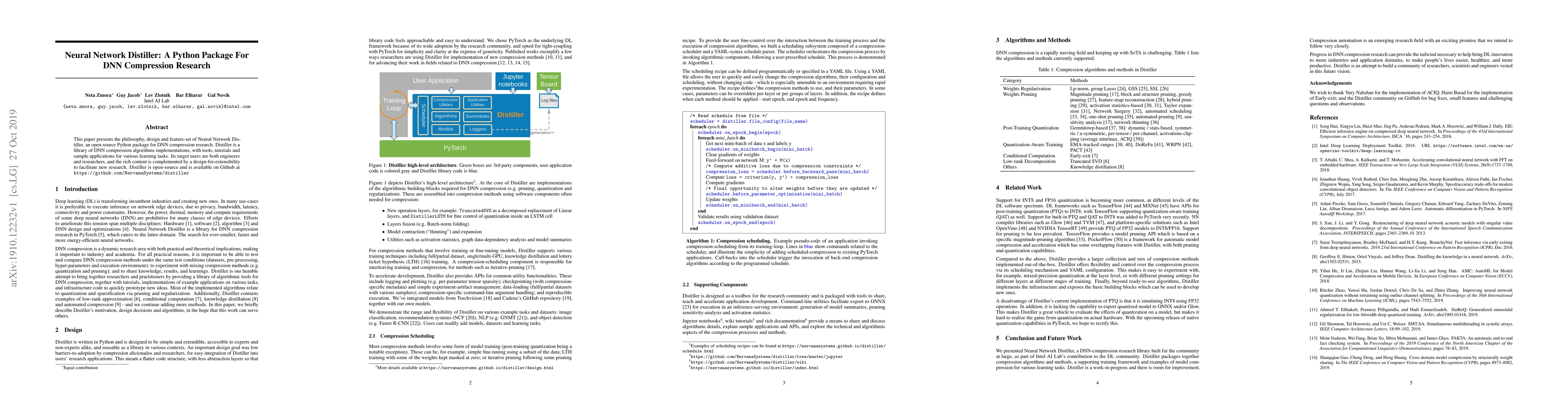This paper introduces Neural Network Distiller, an open-source Python package for DNN compression research, featuring a library of compression algorithms, tools, tutorials, and sample applications to aid both engineers and researchers in their work. It is designed for extensibility to support ongoing research advancements.