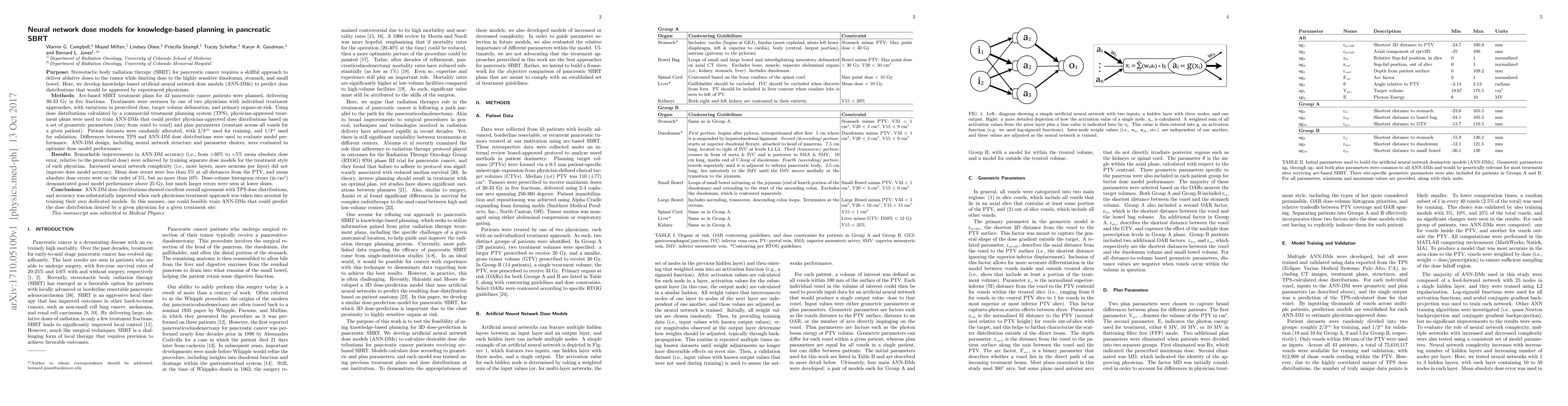 Stereotactic body radiation therapy (SBRT) for pancreatic cancer requires a skillful approach to deliver ablative doses to the tumor while limiting dose to the highly sensitive duodenum, stomach, and small bowel. Here, we develop knowledge-based artificial neural network dose models (ANN-DMs) to predict dose distributions that would be approved by experienced physicians. Using dose distributions calculated by a commercial treatment planning system (TPS), physician-approved treatment plans were used to train ANN-DMs that could predict physician-approved dose distributions based on a set of geometric parameters (vary from voxel to voxel) and plan parameters (constant across all voxels for a given patient). Differences between TPS and ANN-DM dose distributions were used to evaluate model performance. ANN-DM design, including neural network structure and parameter choices, were evaluated to optimize dose model performance. Mean dose errors were less than 5% at all distances from the PTV, and mean absolute dose errors were on the order of 5%, but no more than 10%. Dose-volume histogram errors demonstrated good model performance above 25 Gy, but much larger errors were seen at lower doses. ANN-DM dose distributions showed excellent overall agreement with TPS dose distributions, and accuracy was substantially improved when each physician's treatment approach was taken into account by training their own dedicated models. In this manner, one could feasibly train ANN-DMs that could predict the dose distribution desired by a given physician for a given treatment site.
