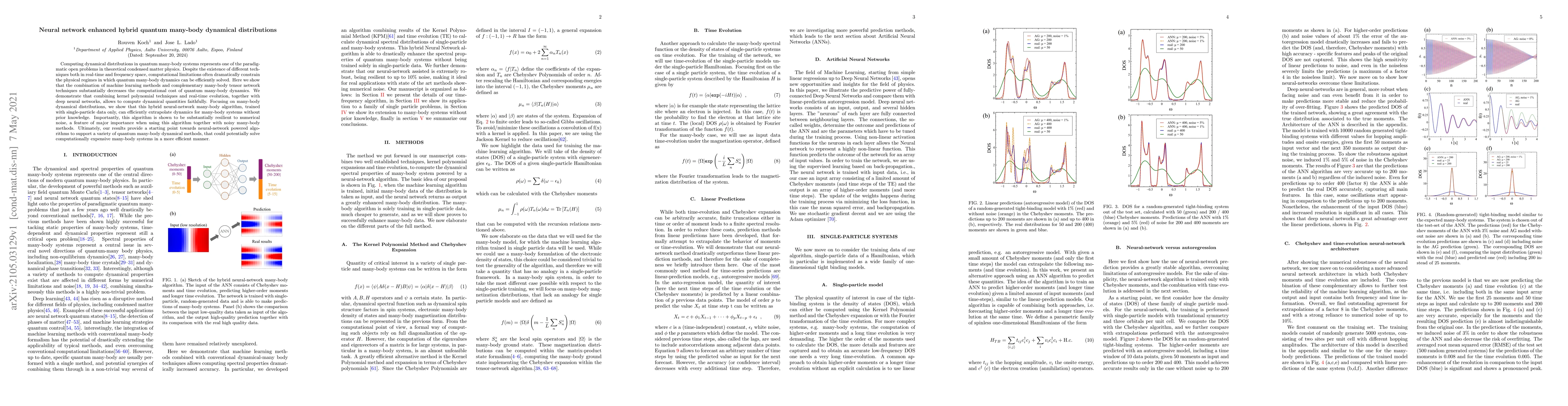 Computing dynamical distributions in quantum many-body systems represents one of the paradigmatic open problems in theoretical condensed matter physics. Despite the existence of different techniques both in real-time and frequency space, computational limitations often dramatically constrain the physical regimes in which quantum many-body dynamics can be efficiently solved. Here we show that the combination of machine learning methods and complementary many-body tensor network techniques substantially decreases the computational cost of quantum many-body dynamics. We demonstrate that combining kernel polynomial techniques and real-time evolution, together with deep neural networks, allows to compute dynamical quantities faithfully. Focusing on many-body dynamical distributions, we show that this hybrid neural-network many-body algorithm, trained with single-particle data only, can efficiently extrapolate dynamics for many-body systems without prior knowledge. Importantly, this algorithm is shown to be substantially resilient to numerical noise, a feature of major importance when using this algorithm together with noisy many-body methods. Ultimately, our results provide a starting point towards neural-network powered algorithms to support a variety of quantum many-body dynamical methods, that could potentially solve computationally expensive many-body systems in a more efficient manner.