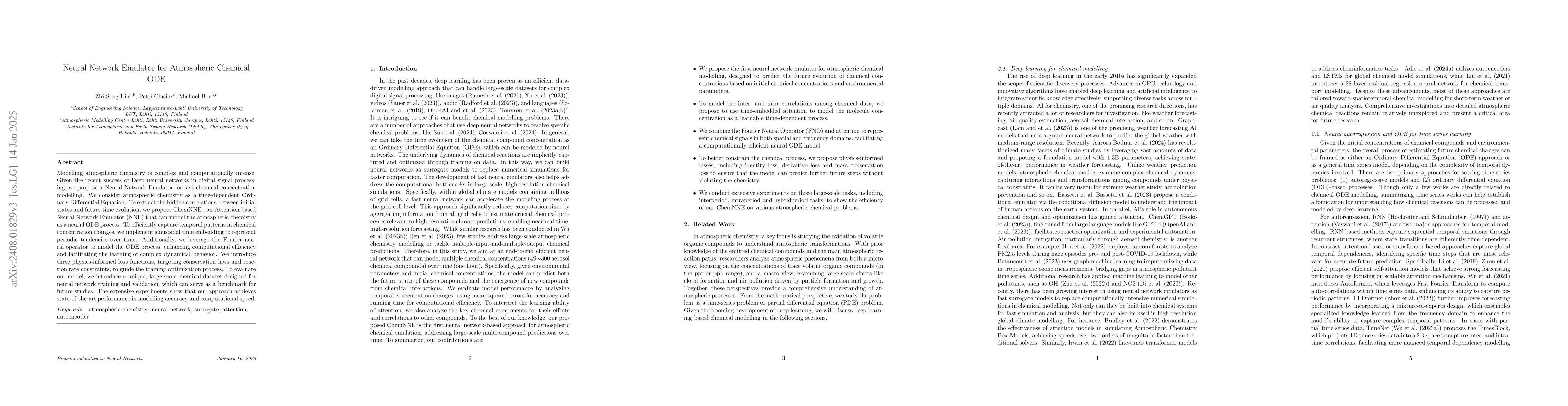 This paper proposes ChemNNE, an Attention-based Neural Network Enumerator that leverages neural ODEs and Fourier neural operators to efficiently model atmospheric chemical processes as time-dependent Ordinary Differential Equations. The approach achieves state-of-the-art accuracy and speed, aided by a new large-scale chemical dataset for training and evaluation.