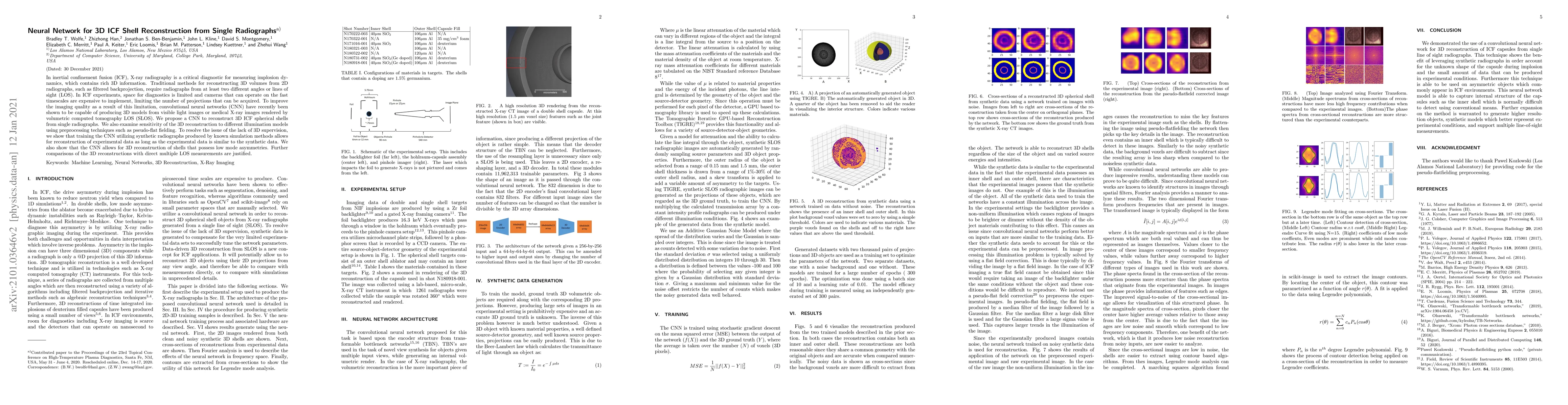 In inertial confinement fusion (ICF), X-ray radiography is a critical diagnostic for measuring implosion dynamics, which contains rich 3D information. Traditional methods for reconstructing 3D volumes from 2D radiographs, such as filtered backprojection, require radiographs from at least two different angles or lines of sight (LOS). In ICF experiments, space for diagnostics is limited and cameras that can operate on the fast timescales are expensive to implement, limiting the number of projections that can be acquired. To improve the imaging quality as a result of this limitation, convolutional neural networks (CNN) have recently been shown to be capable of producing 3D models from visible light images or medical X-ray images rendered by volumetric computed tomography LOS (SLOS). We propose a CNN to reconstruct 3D ICF spherical shells from single radiographs. We also examine sensitivity of the 3D reconstruction to different illumination models using preprocessing techniques such as pseudo-flat fielding. To resolve the issue of the lack of 3D supervision, we show that training the CNN utilizing synthetic radiographs produced by known simulation methods allows for reconstruction of experimental data as long as the experimental data is similar to the synthetic data. We also show that the CNN allows for 3D reconstruction of shells that possess low mode asymmetries. Further comparisons of the 3D reconstructions with direct multiple LOS measurements are justified.