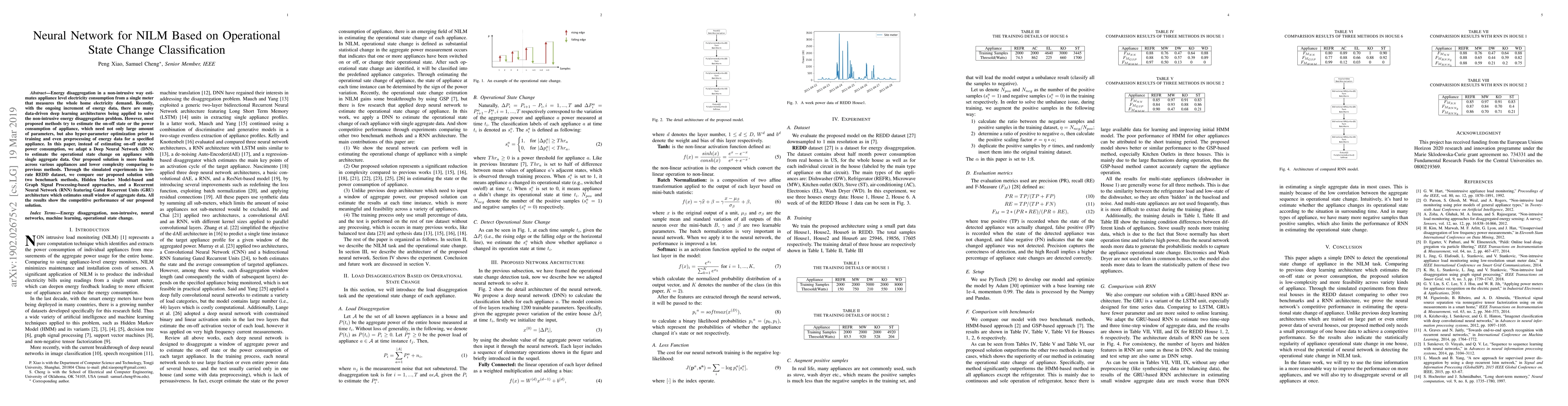 Energy disaggregation in a non-intrusive way estimates appliance level electricity consumption from a single meter that measures the whole house electricity demand. Recently, with the ongoing increment of energy data, there are many data-driven deep learning architectures being applied to solve the non-intrusive energy disaggregation problem. However, most proposed methods try to estimate the on-off state or the power consumption of appliance, which need not only large amount of parameters, but also hyper-parameter optimization prior to training and even preprocessing of energy data for a specified appliance. In this paper, instead of estimating on-off state or power consumption, we adapt a neural network to estimate the operational state change of appliance. Our proposed solution is more feasible across various appliances and lower complexity comparing to previous methods. The simulated experiments in the low sample rate dataset REDD show the competitive performance of the designed method, with respect to other two benchmark methods, Hidden Markov Model-based and Graph Signal processing-based approaches.