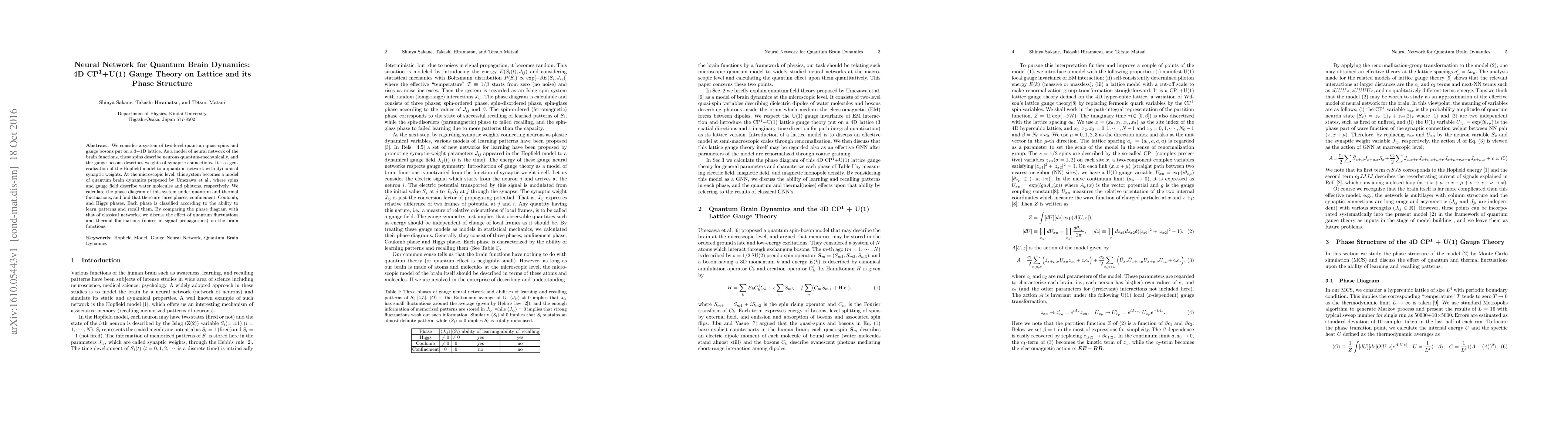 This paper proposes a neural network model based on quantum quasi-spins and gauge bosons on a 3+1D lattice to simulate quantum brain dynamics. It identifies three phases—confinement, Coulomb, and Higgs—and discusses how quantum and thermal fluctuations affect learning and memory in quantum networks compared to classical networks.