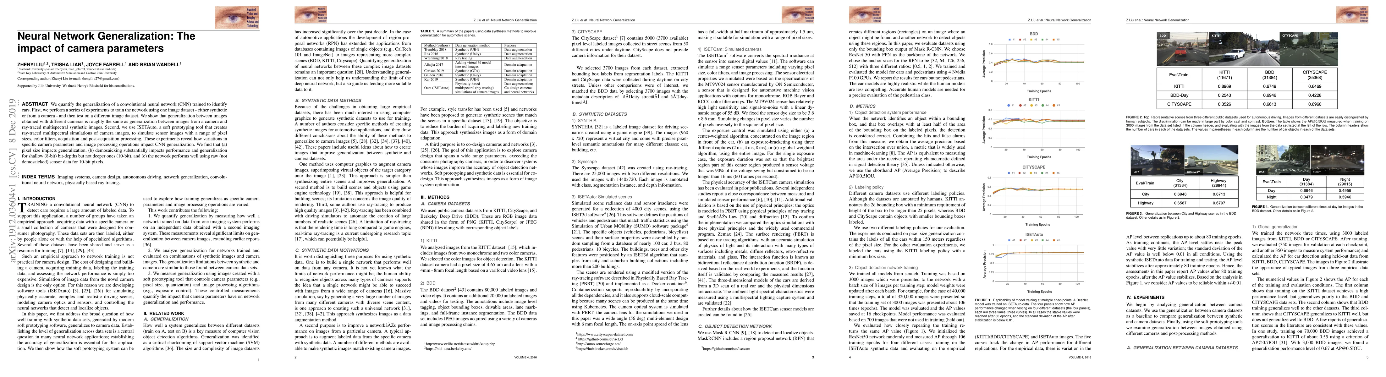 We quantify the generalization of a convolutional neural network (CNN) trained to identify cars. First, we perform a series of experiments to train the network using one image dataset - either synthetic or from a camera - and then test on a different image dataset. We show that generalization between images obtained with different cameras is roughly the same as generalization between images from a camera and ray-traced multispectral synthetic images. Second, we use ISETAuto, a soft prototyping tool that creates ray-traced multispectral simulations of camera images, to simulate sensor images with a range of pixel sizes, color filters, acquisition and post-acquisition processing. These experiments reveal how variations in specific camera parameters and image processing operations impact CNN generalization. We find that (a) pixel size impacts generalization, (b) demosaicking substantially impacts performance and generalization for shallow (8-bit) bit-depths but not deeper ones (10-bit), and (c) the network performs well using raw (not demosaicked) sensor data for 10-bit pixels.