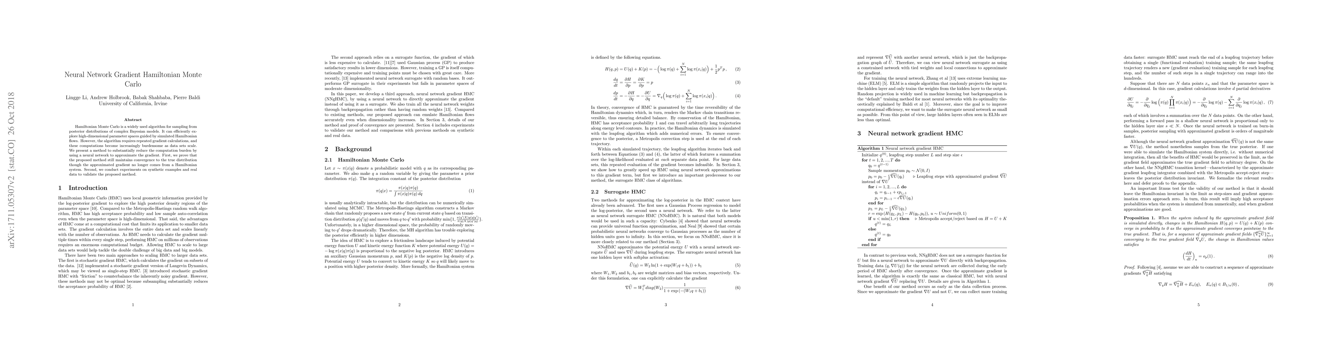 This paper introduces a neural network to approximate gradients in Hamiltonian Monte Carlo, reducing computational costs for large datasets. The method maintains convergence despite the gradient approximation, and experiments show its effectiveness on both synthetic and real data.
