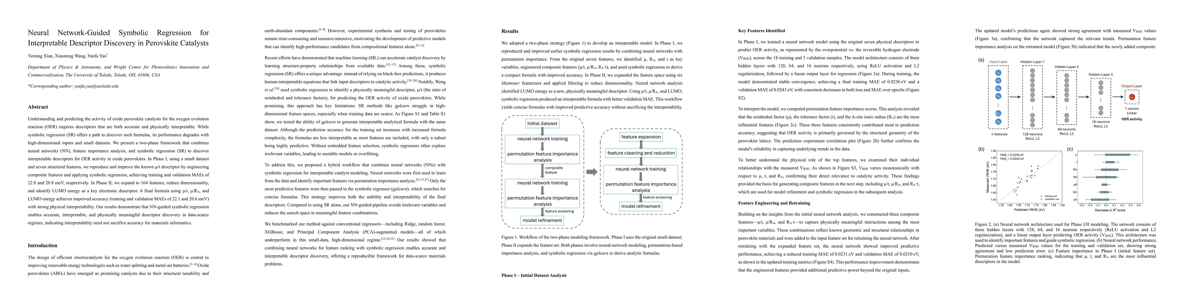 This research introduces a two-phase framework that combines neural networks, feature importance analysis, and symbolic regression to discover interpretable descriptors for OER activity in oxide perovskites. The method successfully reproduces and improves the known μ/t descriptor, identifies LUMO energy as a key electronic descriptor, and creates a final formula with enhanced accuracy and strong physical interpretability, demonstrating that interpretability and accuracy can coexist in materials informatics.
