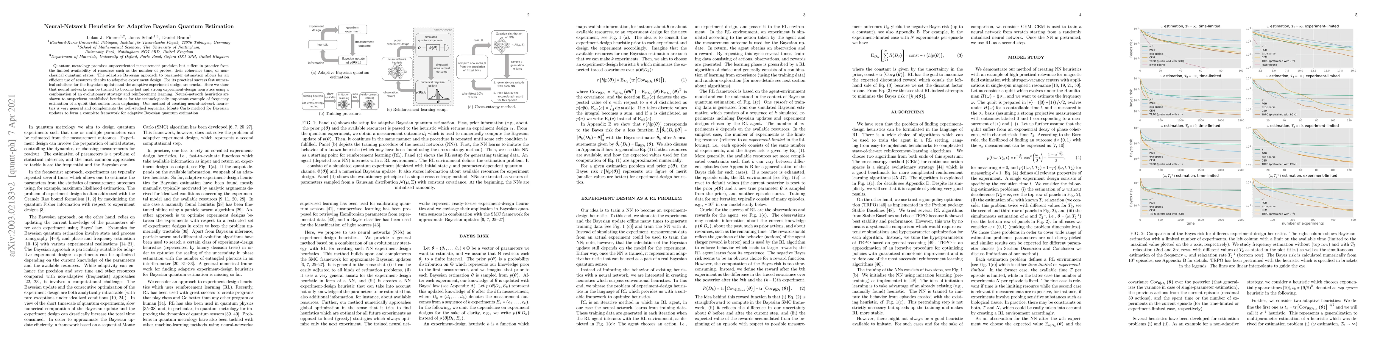Quantum metrology promises unprecedented measurement precision but suffers in practice from the limited availability of resources such as the number of probes, their coherence time, or non-classical quantum states. The adaptive Bayesian approach to parameter estimation allows for an efficient use of resources thanks to adaptive experiment design. For its practical success fast numerical solutions for the Bayesian update and the adaptive experiment design are crucial. Here we show that neural networks can be trained to become fast and strong experiment-design heuristics using a combination of an evolutionary strategy and reinforcement learning. Neural-network heuristics are shown to outperform established heuristics for the technologically important example of frequency estimation of a qubit that suffers from dephasing. Our method of creating neural-network heuristics is very general and complements the well-studied sequential Monte-Carlo method for Bayesian updates to form a complete framework for adaptive Bayesian quantum estimation.