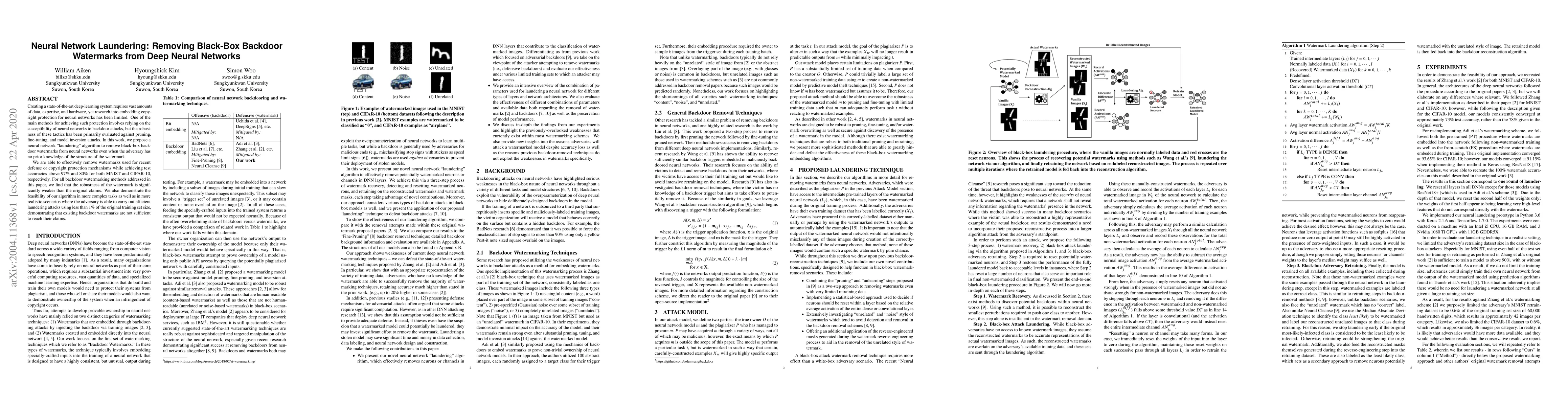 This paper proposes a neural network "laundering" algorithm to remove black-box backdoor watermarks from deep neural networks, showing it can effectively strip out watermarks used for defense and copyright protection while maintaining high test accuracy. The study reveals that existing backdoor watermarks are less robust than previously claimed, especially when using minimal training data for the laundering process.