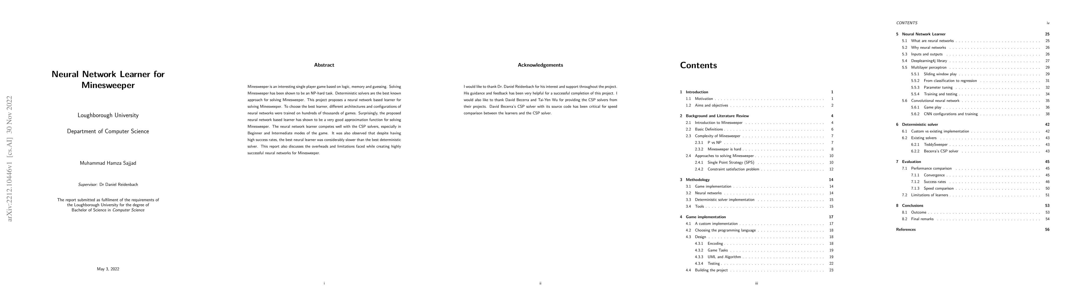 This paper proposes a neural network learner for solving Minesweeper, demonstrating its effectiveness as an approximation function, especially in Beginner and Intermediate modes, though it is slower than deterministic solvers. The study explores various neural network architectures and highlights the challenges and limitations in achieving high success rates.