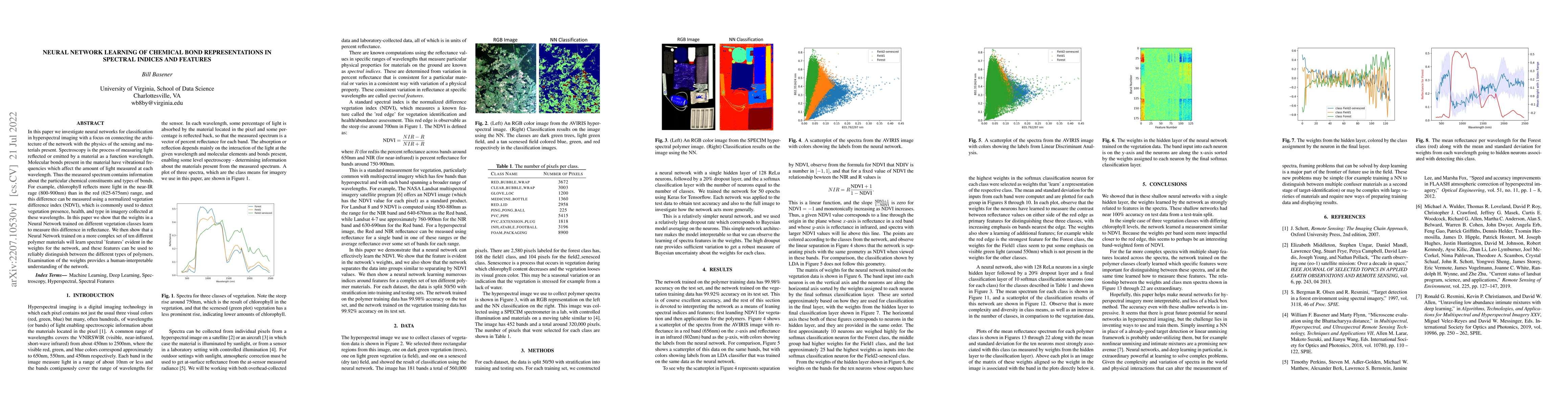 In this paper we investigate neural networks for classification in hyperspectral imaging with a focus on connecting the architecture of the network with the physics of the sensing and materials present. Spectroscopy is the process of measuring light reflected or emitted by a material as a function wavelength. Molecular bonds present in the material have vibrational frequencies which affect the amount of light measured at each wavelength. Thus the measured spectrum contains information about the particular chemical constituents and types of bonds. For example, chlorophyll reflects more light in the near-IR rage (800-900nm) than in the red (625-675nm) range, and this difference can be measured using a normalized vegetation difference index (NDVI), which is commonly used to detect vegetation presence, health, and type in imagery collected at these wavelengths. In this paper we show that the weights in a Neural Network trained on different vegetation classes learn to measure this difference in reflectance. We then show that a Neural Network trained on a more complex set of ten different polymer materials will learn spectral 'features' evident in the weights for the network, and these features can be used to reliably distinguish between the different types of polymers. Examination of the weights provides a human-interpretable understanding of the network.
